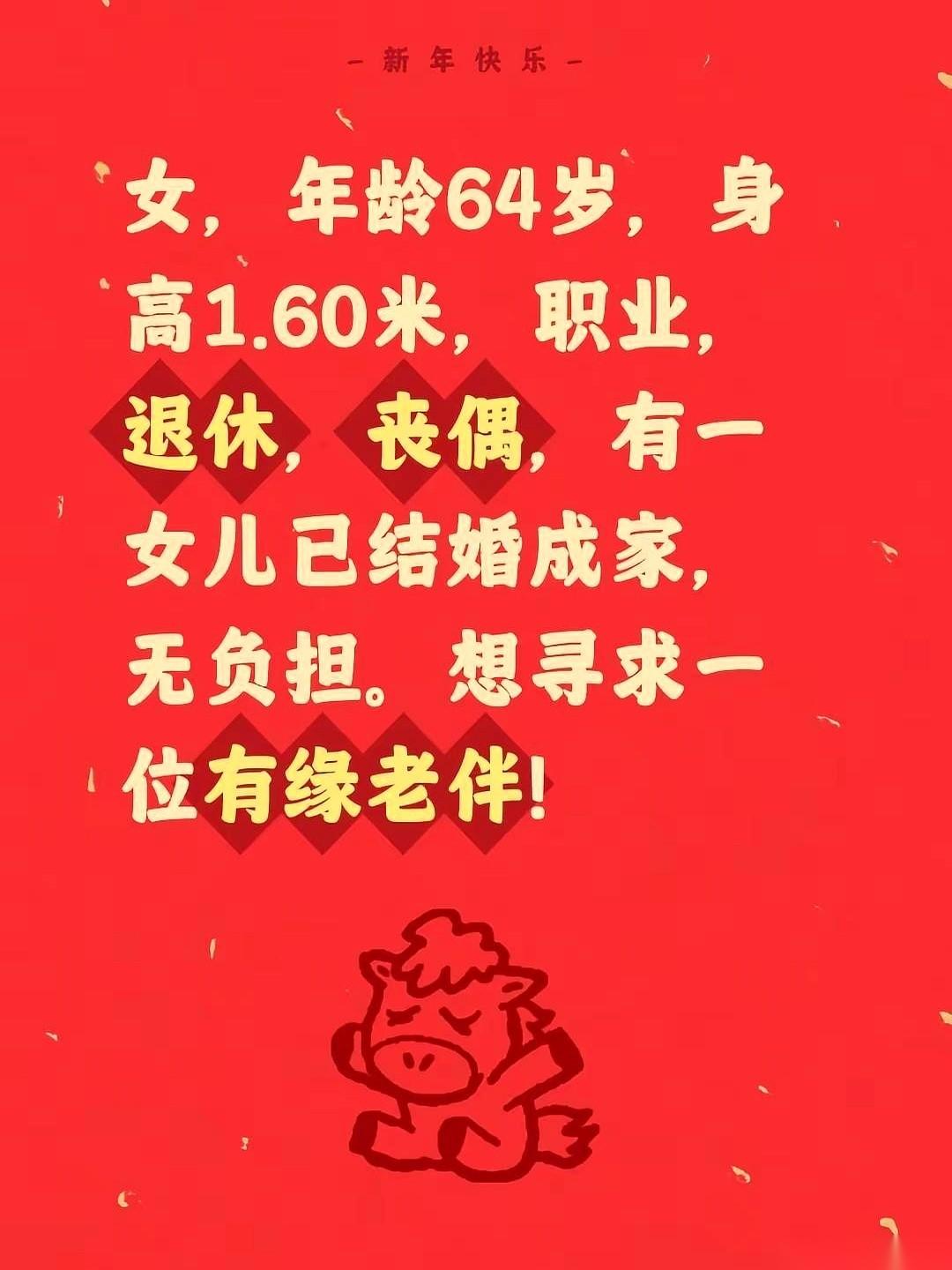 刷到一条相亲帖,心里咯噔一下。 不是什么帅哥美女,就是一个普普通通的64岁阿姨。 丧偶,女儿已成家,想找个老伴儿。 寥寥几句,把一辈子都交代了。 最扎心的是那句“无负担”。 这三个字,藏了多少委屈和懂事啊。意思是,我身体还行,有退休金,不指望你养,也不给你添乱。我孩子大了,不用你操心,更不会跟你孩子争家产。 我就是……有点孤单。 说白了,就是想找个人,晚上能一起看看电视,念叨念叨家长里短。 就是想找个人,做了饭有人夸一句好吃,生了病有人在旁边递杯热水。 就是想找个人,证明自己忙活了一辈子,到老了,还有被爱、被需要的资格。 我们总觉得父母辈的感情就是搭伙过日子,为了孩子,为了责任。 可忘了他们也是从十几二十岁的青春里走过来的,也曾心动过,也渴望分享,渴望一个眼神就懂的默契。 灵魂的热闹,跟年龄有屁关系。 真希望这位阿姨能找到那个陪她看夕阳,饭后能一起散步遛弯的人。 人这一辈子,甭管多大年纪,想找个人好好爱,想有个人好好爱自己,这事儿,太他妈对了。