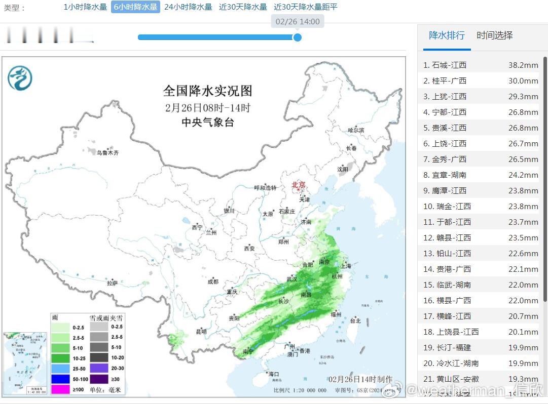 【降水】今天08-14时,南方的降水可见有两条雨带,偏北的区域对应冷暖交汇的切变线降水,偏南的区域为暖湿气流内讧的暖区降雨,部分站点还出现了单小时20毫米以上的短时强降雨,比如江西的宁都和石城。