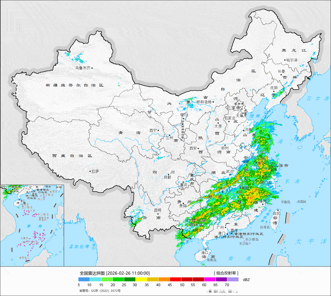 从雷达动画看,降水总体在缓慢东移。今天下午到明天中午,南方还有大范围降雨,江南南部和华南北部有大雨、局地暴雨。另外新疆天山西段,还有明显降雪。此外华北和东北的部分地区也可能有降雪或雨转雪。