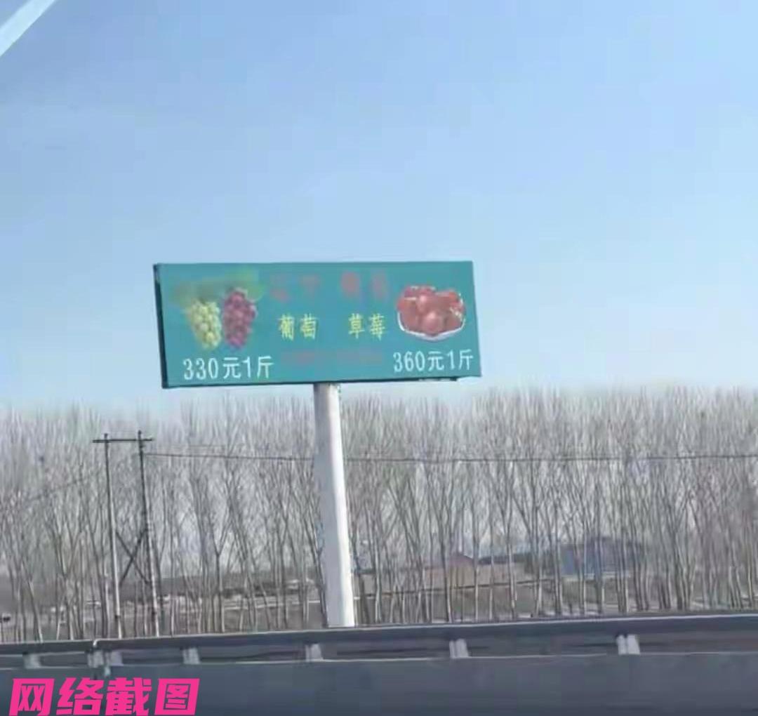 辽宁高速上有人见到标有天价的水果广告牌。 在这广告牌上面,有写到葡萄330元/斤、草莓360元/斤,产地辽宁熊岳,这个价格非常有点令人不敢置信,非要写这么高贵价格的背后,有什么理由表明可以如此堂而皇之的公布。 原来这就一家主打国王系列的水果,具体价高原因也是在于无公害,种植成本高,还有就是灌溉用牛奶兑水进行,总之就是成本高,品质优,但这样的价格还是让人无比的感慨,这不是水果,这是王母娘娘蟠桃园出来的仙果,一般人吃不起。 其实在众人眼里是夸大其词还是如实描述,这里有太多的疑问会在众人心里提出,当然我们要认定,即便价高肯定有消费市场,这样的贵族水果定然不是服务普通家庭,一般人看看也就罢了。 我们只有在好奇的理解里看出这样一件事,存在高价的物品也要有合理性,同时只在不断打开我们对于这个世界的感官,最终应该知道就行,有条件者当然可以品尝,我们只是看看罢了。
