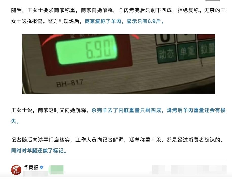 重庆的王女士除夕夜带着家人在当地一家大草原烤全羊店消费,选的活羊当场称了有36斤,结果烤好端上桌,看着羊的个头特别小,肉也薄得很,王女士心里犯了嘀咕,就让商家给烤好的羊称重,可商家说羊肉烤完后重量只剩四成,硬是不肯复称。没办法王女士只好报了警,警方到了之后,商家才肯称重,结果出来才只有6.9斤,这重量差得也太多了。面对质疑,商家还解释说活羊有个体差异,有的爱动有的不爱动,烤出来重量不一样,还说这只羊烤得比较干,水分流失多所以才轻。王女士根本没法接受这样的说法,这事也引来不少人质疑商家做手脚。后来官方调查通报,才发现是商家为了虚增重量,在宰杀前给活羊非正常投喂了饲料和水,这下才算弄清了原委。