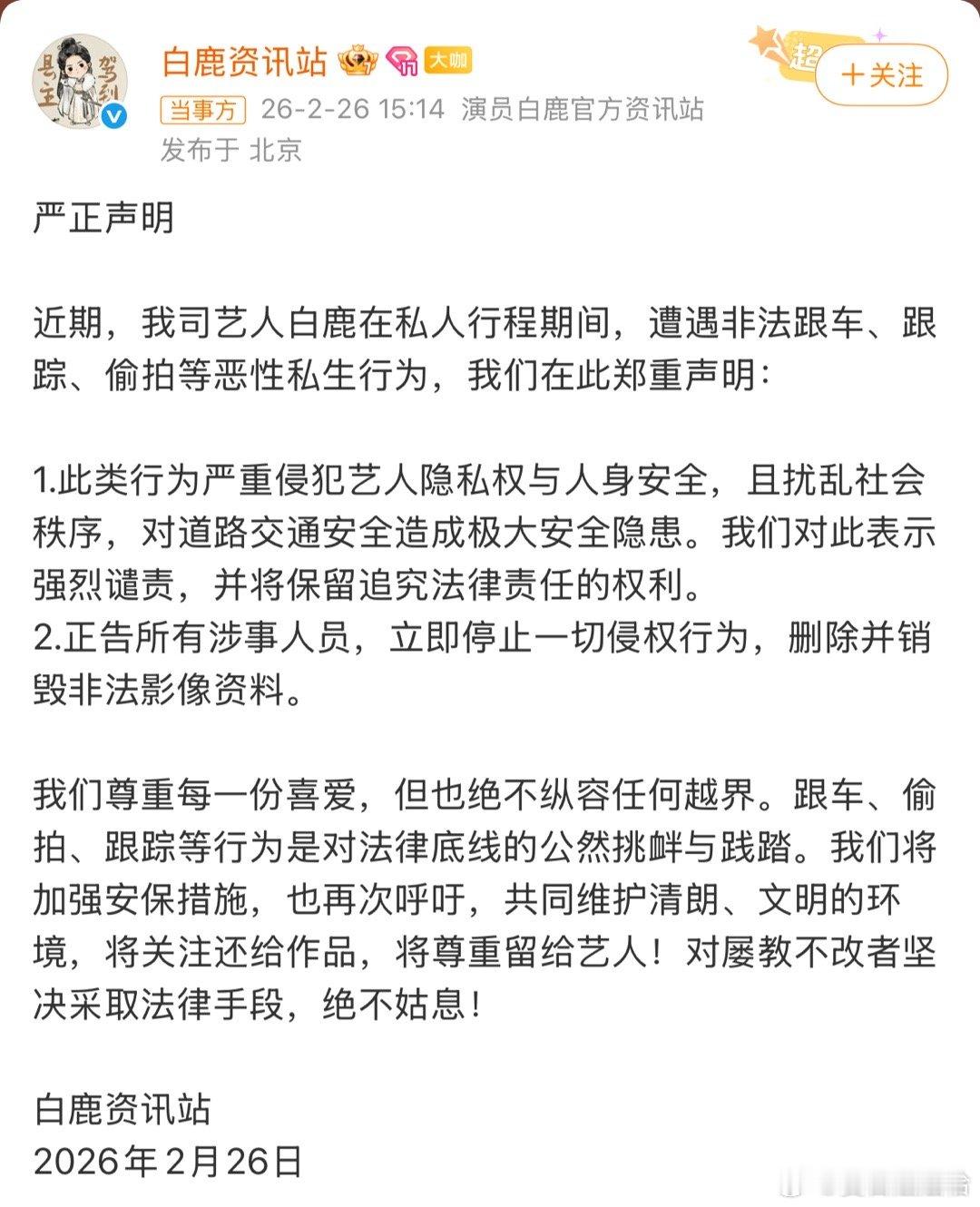 白鹿路边下车抓私生被长期跟车骚扰逼到忍无可忍,白鹿当场停车下车对峙,气场全开又让人心疼。温柔从不是被肆意打扰的理由,跟车、尾随、偷拍早已越界,严重威胁安全、触犯底线。喜爱要有边界,追星请守规矩,拒绝私生,尊重艺人正常生活与人身安全。娱乐 白鹿路边下车抓私生