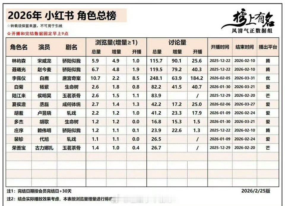 2026年剧集🍠剧集/角色总榜 宋威龙主演的《骄阳似我》剧集和角色都登顶第一