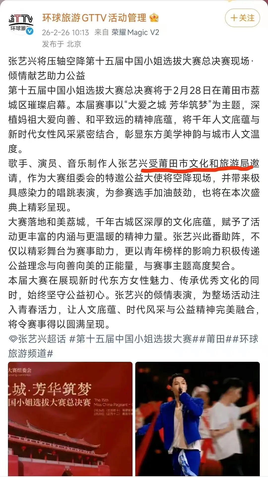 开年大花轿大爆 节后开工第一个工作就是受莆田文旅邀请 张艺兴的事业运绝了