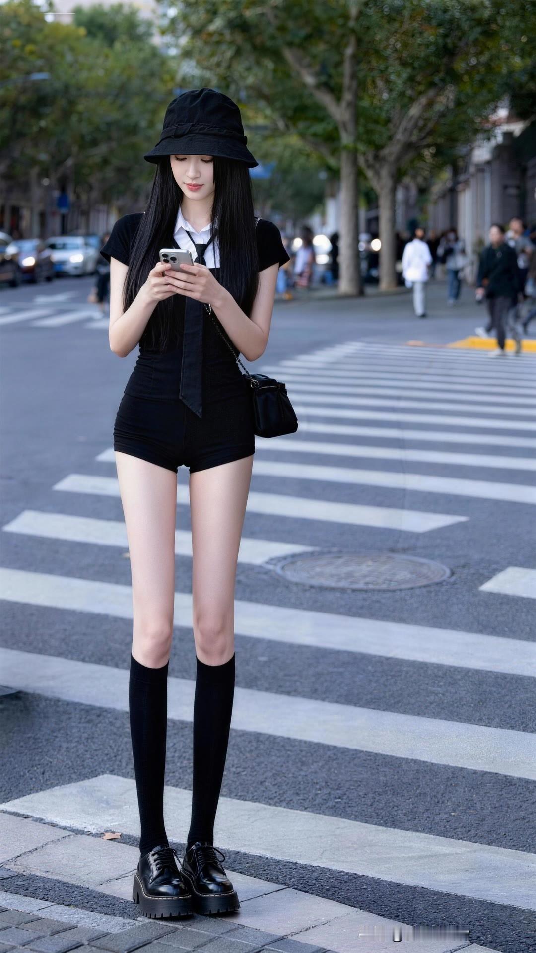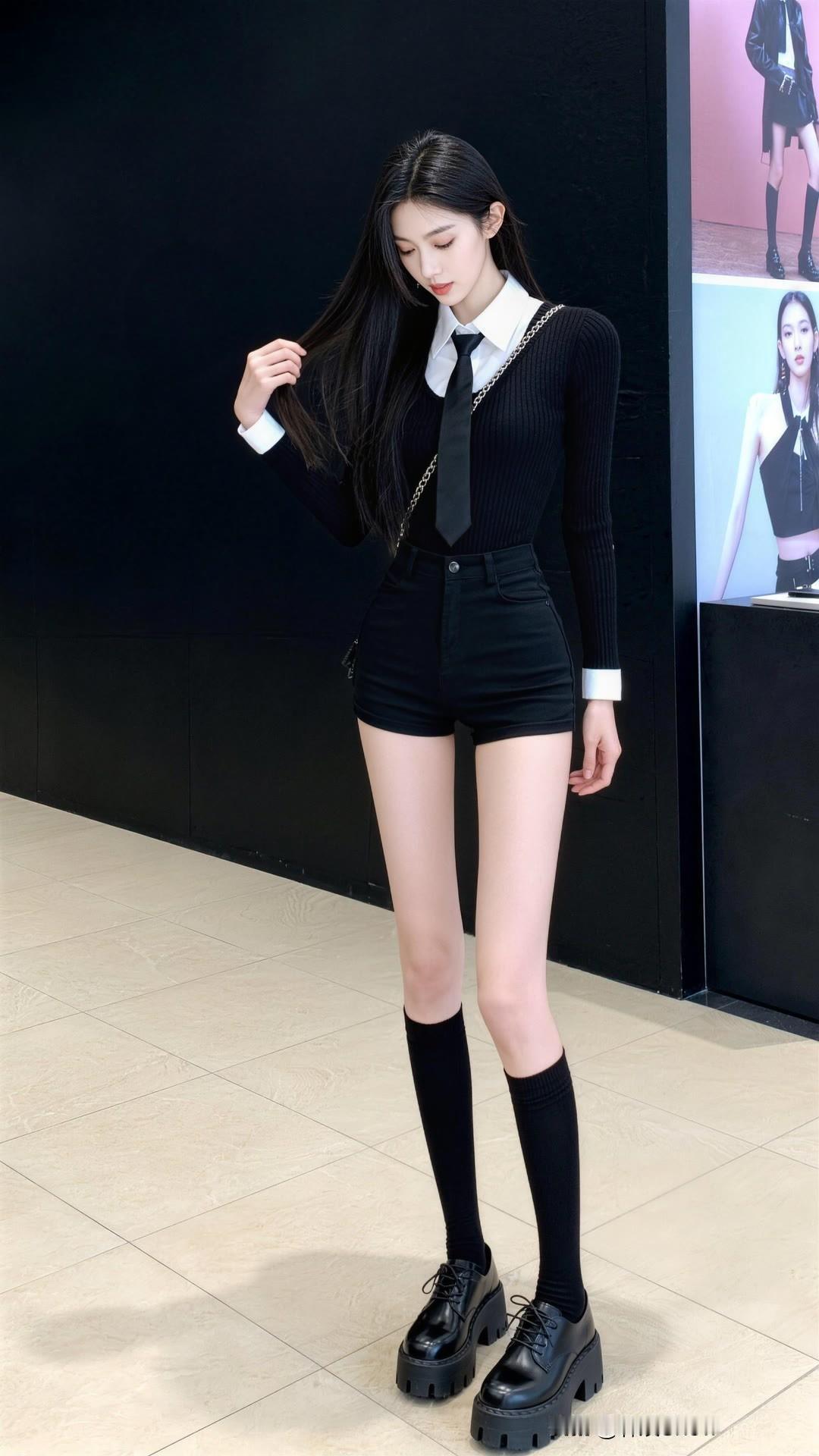 黑色学院风穿搭,搭配高筒袜和厚底鞋,尽显青春活力!大长腿