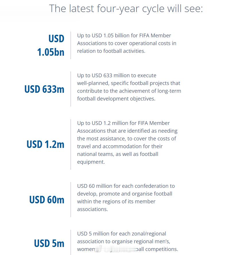 50亿美元,除以200是2500万美元,中国足协拿到的并不夸张,很多钱是给非洲、南美这样的地方,比如加纳足协,刚刚发了一堆感谢因凡蒂诺的内容,足协主席直接喊因凡蒂诺大哥了都,显然是也拿到钱啦。