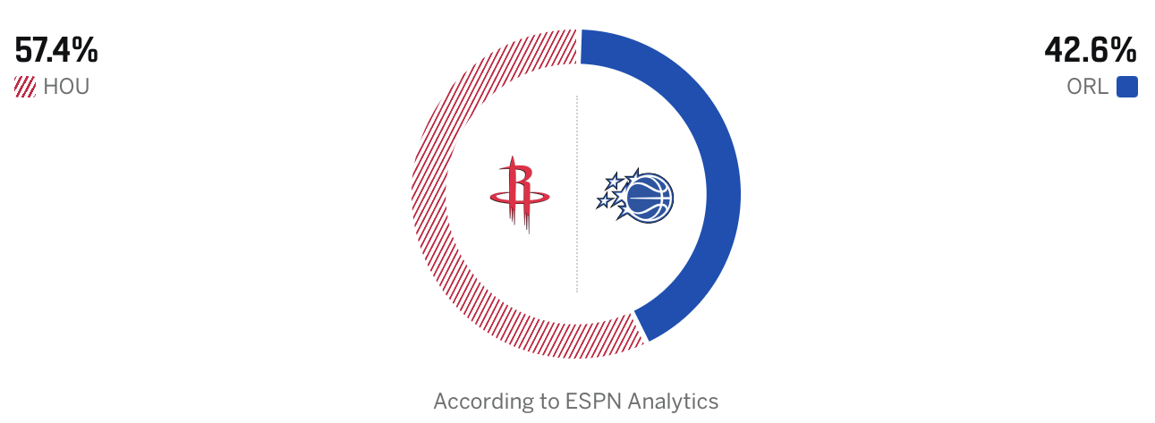 ESPN预测火箭vs魔术:火箭胜率57.4%,魔术胜率42.6%