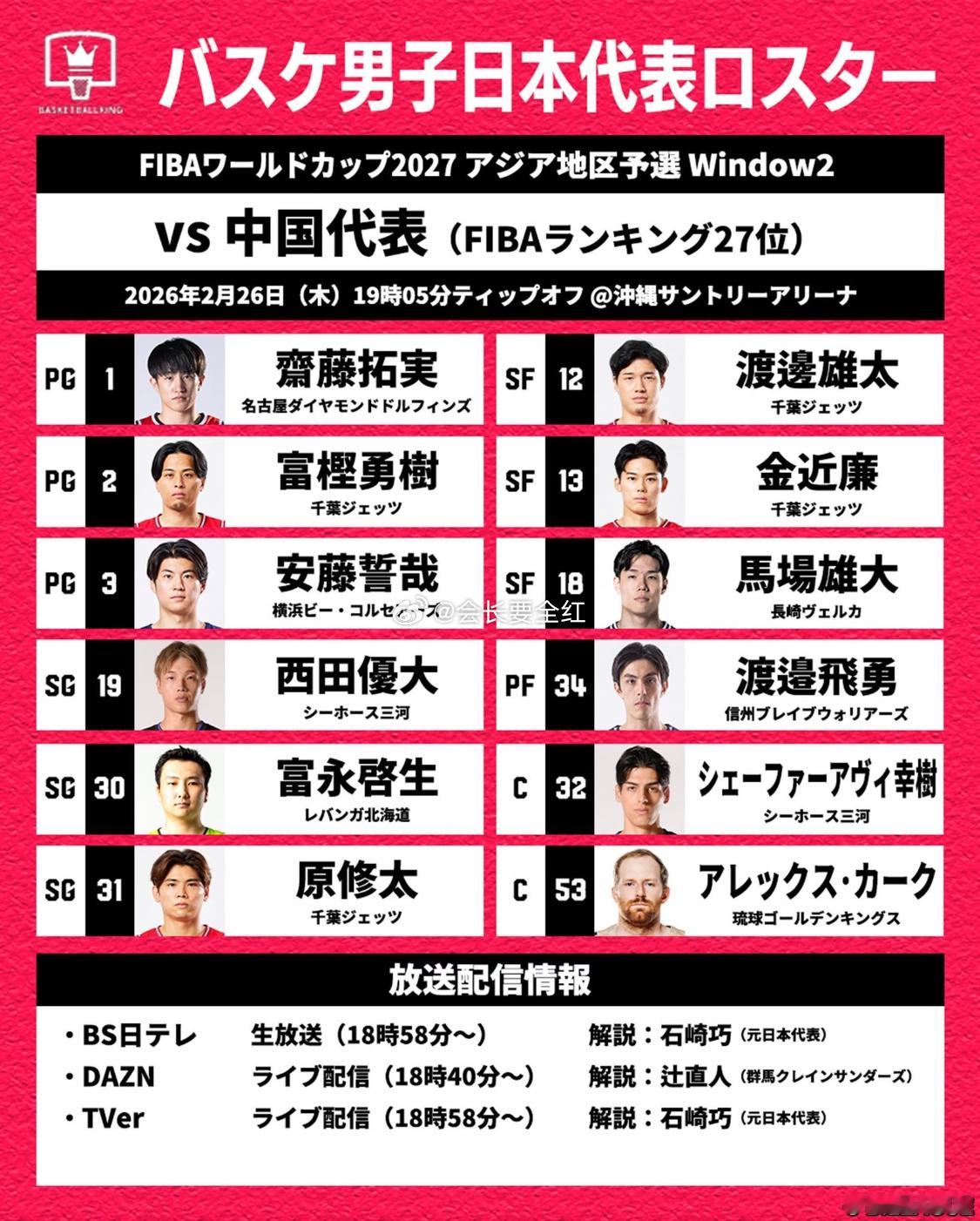 今晚对阵中国男篮的12人名单也已经确定。核心归化球员霍金森意外落选,新帅桶谷大启用的嫡系是另一名归化球员、36岁老将53-阿莱克斯·科克。其他11人为:3-安藤誓哉,2-富坚勇树,31-原修太,前NBA球员12-渡边雄太,1-齐藤拓実,18-马场雄大,32-幸树,34-渡边飞勇,19-西田优大,30-富永启生,13-金近廉。