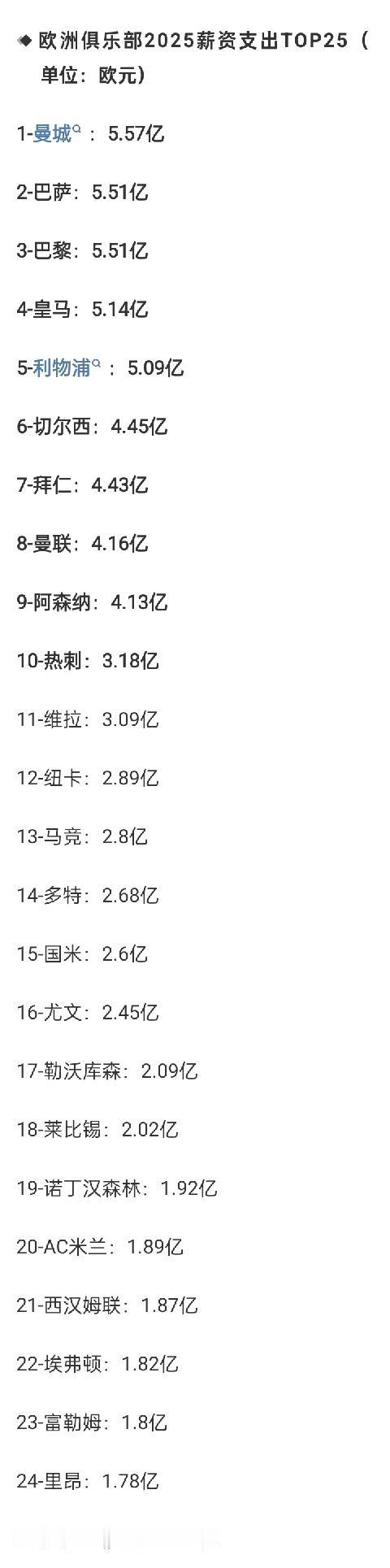 欧洲俱乐部薪资支出排名:曼城5.57亿欧领跑,巴萨巴黎皇马利物浦均超5亿 02月26日 欧足联公布新一期俱乐部财务状况报告,其中欧洲俱乐部在2025年的薪资支出排名:曼城5.57亿欧第一,巴萨巴黎皇马利物浦均超5亿,切尔西 拜仁 曼联 阿森纳 热刺均进入前十