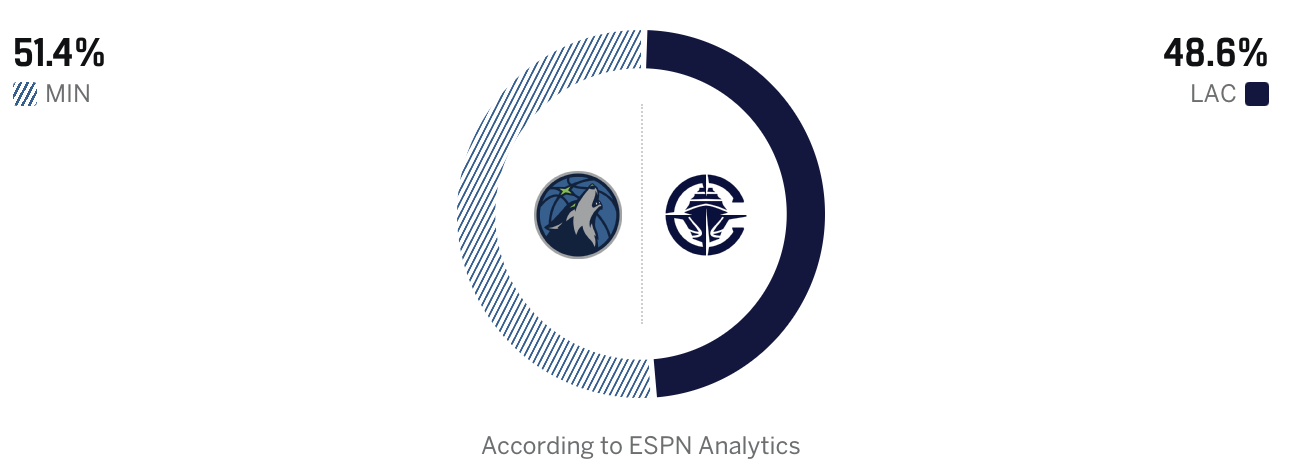 ESPN预测森林狼vs快船:森林狼胜率51.4%,快船胜率48.5%