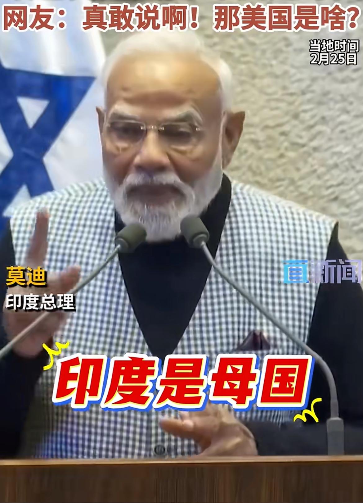 真荒唐!莫迪竟称以色列是父国,印度是母国! 2月25日,正在以色列访问的印度总理莫迪前往该国议会发表讲话。其间,莫迪把以色列与印度的关系形容成“父国”和“母国”。 莫迪简直不知怎样谄媚才恰当,竟开始论起公母,还自封印度为母。这算怎么回事,为了讨好以色列,连这般怪异的说法都能想得出来,也只有印度人能如此了。无论怎样,国家间交往讲究平等尊重,哪有这般谄媚的。这种怪异说法不仅显得他毫无底线,也让印度在国际上沦为笑柄。 看他那副丑态,真是厚颜无耻!