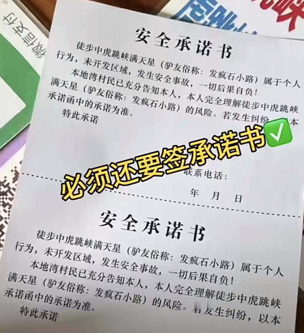 旅游没有KPI,打卡别硬来,别说来都来了,就怕来了去了! 发疯石并不是景区景点,而是当地人放羊走路的小道。 公路旁边有个小屋子,屋子的侧面用蓝色牌子写着“发疯石”入口,进去要签安全承诺书,从屋子另一门出去就是一条陡峭的羊肠小道,没有护栏,也木有台阶,走下去就到江边。 走过一块木板就到发疯石,这个位置背景就是浪花飞溅,很壮观,而且很危险! 不少游客看到别人说虎跳峡必打卡的景点,也不管安不安全就去了。 也有人说,来都来了,还是去看看。 以前我去庐山玩,总会看到有人爬过栏杆间的铁链,站到外面的大石头上去照相,看上去就很危险,等他们照相时,我都不敢出声,怕惊到别人,掉下去咋办! 还有一次,在崂山,那一堆大石头之间,一个几岁的小孩子爬来爬去,一个不小心就滑到下面的栏杆边沿,还好没出事,但也把人吓一跳! 所以,旅游还是要注意安全!