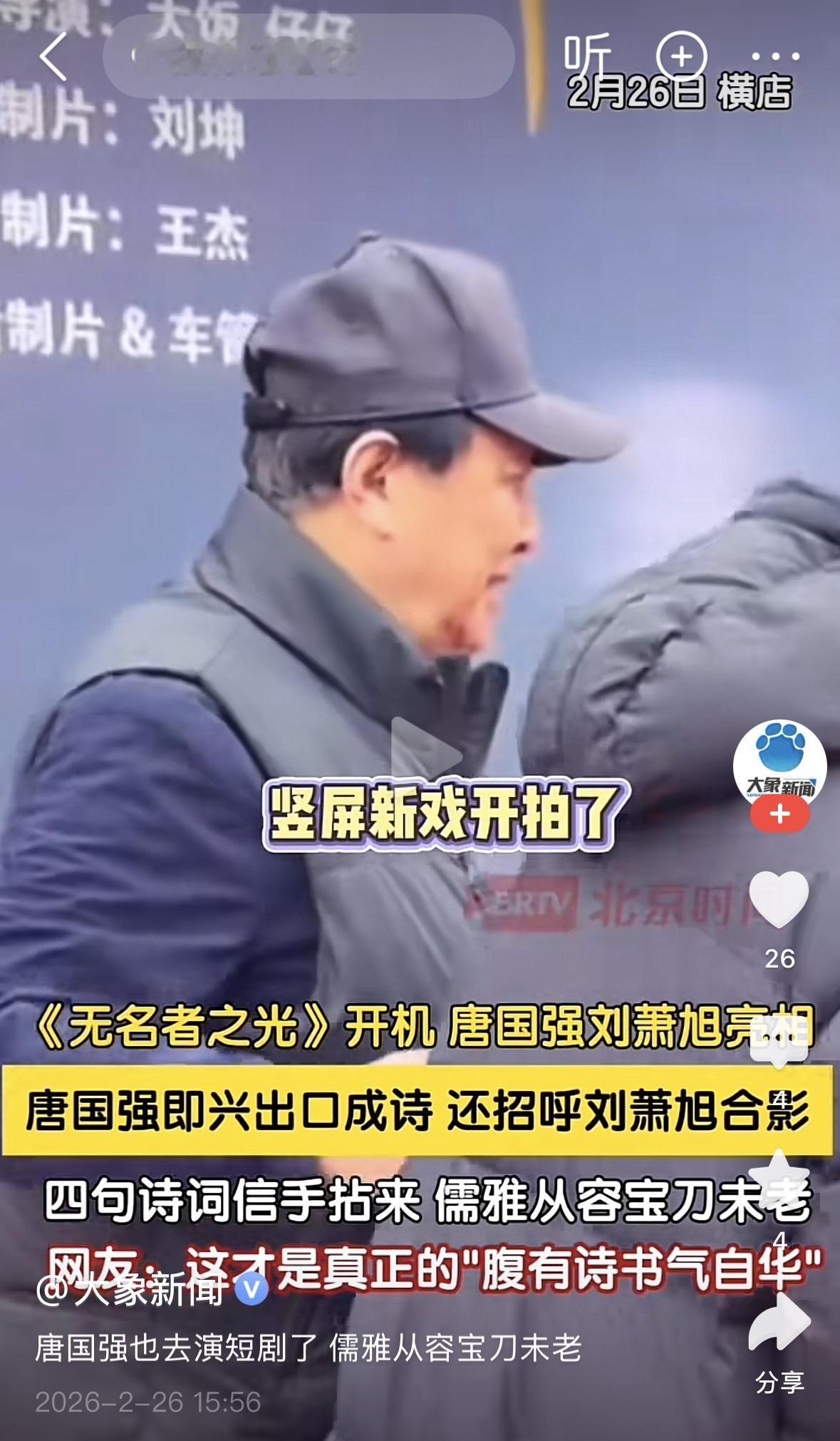 73岁唐国强杀进短剧圈!现场即兴赋诗,这波“降维打击”我看懂了! 提起唐国强,脑子里不是诸葛亮就是毛主席。但谁能想到,73岁的老爷子竟然也跑去演短剧了。 前几天《无名者之光》开机,唐国强往那一站,还是那股儒雅劲儿。现场即兴来了四句诗:“横店春来早,竖屏新戏开;众人拾柴火,早日传捷报。”虽然不是啥千古名句,但从他嘴里念出来,硬是带着一股正气,全场叫好。 宝刀未老,真不是吹的。 说回短剧。这玩意儿现在有多猛?市场规模已经干到500多亿,把电影票房都超了,用户直奔6个亿。 以前都觉得是年轻人刷着玩,现在银发族才是真主力,有钱有闲就爱看个爽。需求摆在那,市场自然疯长。 个人觉得,唐国强这一脚踩进来,不是啥“老艺术家下凡”,而是真看准了风口。 这就跟当年的直播带货一模一样。最开始是网红在那喊“家人们”,有人觉得low。后来贾乃亮他们进去了,大家才发现,来钱快是真的,谁跟钱过不去?短剧也是这个路子。 以前是网红草台班子,现在刘晓庆来了,李连杰来了,唐国强也来了。这帮人带来的不是流量,是质感。哪怕拍12天,也要抠细节。 说白了,这是来给短剧“正名”的。 往后看,短剧的路子只会越走越宽。一边是继续爽下去的“电子榨菜”,另一边就是像《无名者之光》这种奔着电影质感去的精品。 说不定哪天,你在电影院看的大片,就是热门短剧改编的。这阵风,我是挺看好的。
