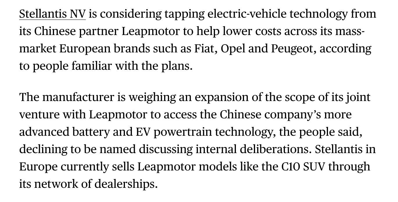 【斯特兰蒂斯正考虑从其中国合作伙伴零跑汽车引进更先进的电池和电动汽车动力系统技术】(技术出海)斯特兰蒂斯(Stellantis)确实正在考虑从其中国合作伙伴零跑汽车 (Leapmotor)引进更先进的电池和电动汽车动力系统技术,以降低其欧洲大众市场品牌的成本,例如菲亚特(Fiat)、欧宝(Opel)和标致(Peugeot)。