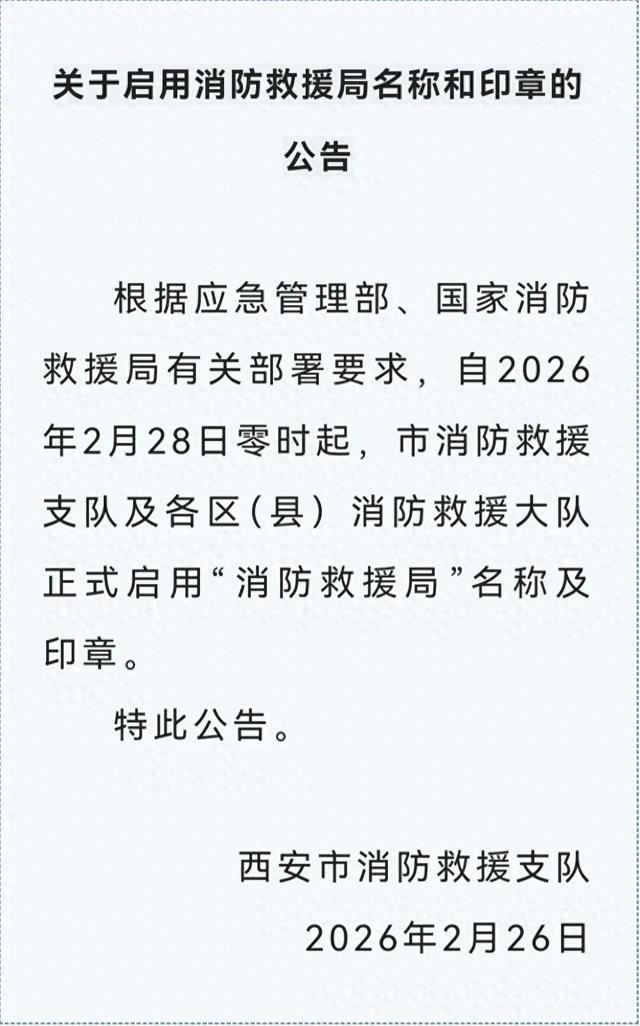 根据应急管理部、国家消防救援局有关部署要求,自2026年2月28日零时起,市消防救援支队及各区(县)消防救援大队正式启用“消防救援局”名称及印章。