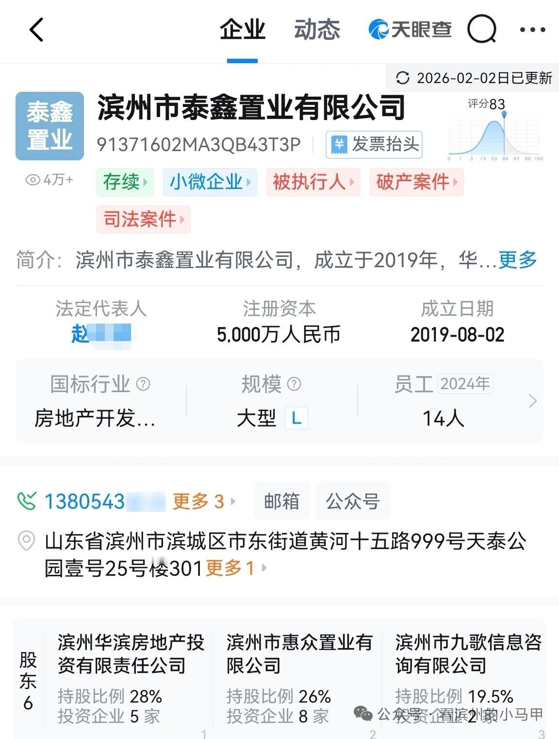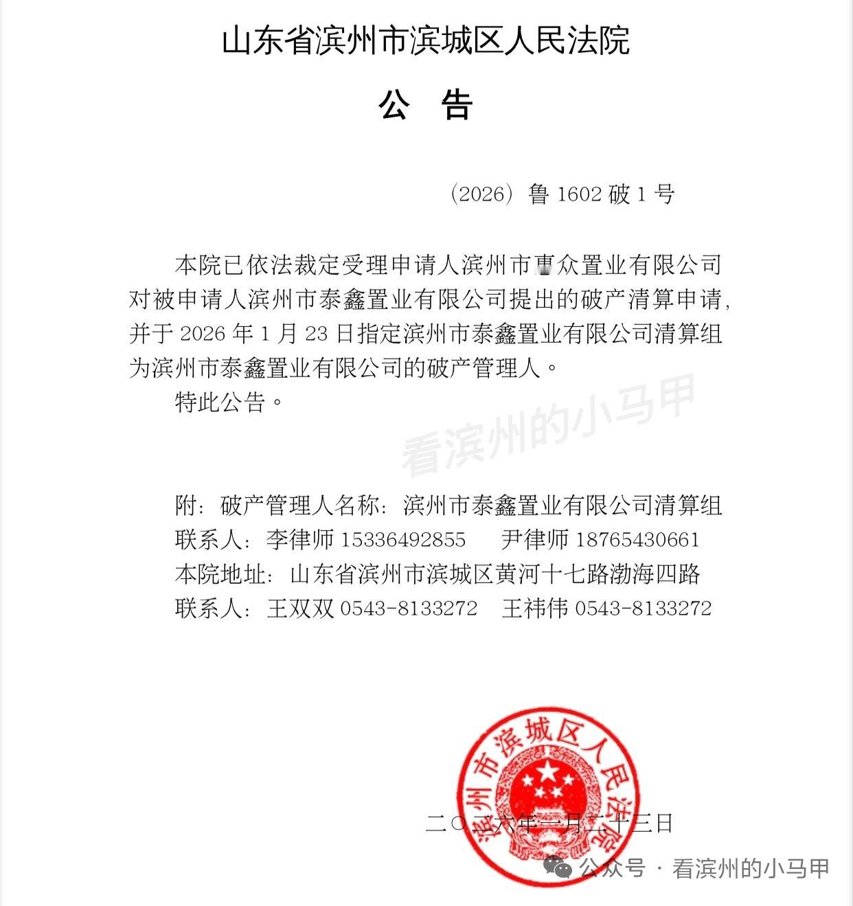 滨州一开发商破产清算 近日,山东滨州天泰公园壹号小区业主反映: 我们小区是新建商品房,目前小区早已交付入住,但全小区均未安装暖气热计量表,不符合交房标准。希望相关部门能协助解决此事。 对此,滨州市滨城区住房和城乡建设局2月26日回应: 公园壹号项目公司目前已进入破产清算工作,暂时无法处理项目问题,无法投入施工,热计量表安装工作需破产清算工作完成后再进行处理。 此前,滨州市滨城区人民法院发公告称:本院已依法裁定受理申请人滨州市惠众置业有限公司对被申请人滨州市泰鑫置业有限公司提出的破产清算申请,并于2026年1月23日指定滨州市泰鑫置业有限公司清算组为滨州市泰鑫置业有限公司的破产管理人。 公开资料显示,滨州市泰鑫置业有限公司已多次被列入失信被执行人,该置业公司股东包括华滨实业、惠众置业和一家信息咨询公司等。 来源 综合人民网地方领导留言板、滨城区法院