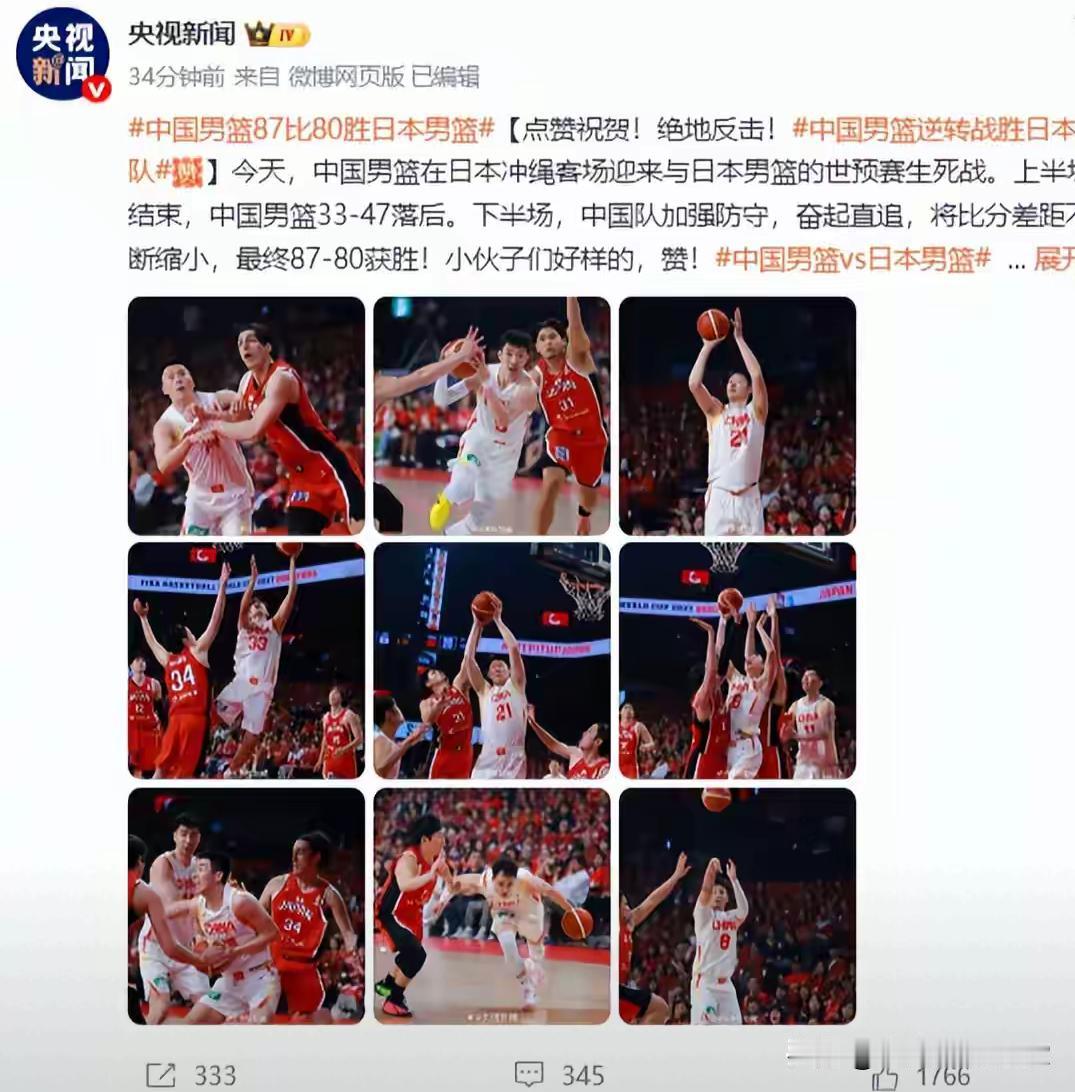给足了肯定。中国男篮客场战胜日本男篮,人民日报和央视新闻发文祝贺,中国男篮上演绝地反击。 下半场中国男篮牛[赞]彻底放下包袱,打出自己应有的水平继伟三分壮态回来四记三分三次助攻胡金秋篮下,贺希宁三记三分,廖三宁的突破日本防守只能用犯规来限制,中国队的罚篮命中率真高,日本队靠裁判追分也难晚回失败的结局。[加油][加油][加油][赞][赞][赞]全场最终比分中国87-80日本,四节详细比分(中国在前)如下: 1. 首节:11-21 2. 次节:22-26(半场33-47) 3. 第三节:25-9(三节58-56反超) 4. 末节:29-24。 为防主场裁判疯狂“加持”、对手提前警惕,郭导直接上演顶级示弱战术!上半场故意收着打、假装被动,让对面飘得以为稳赢。等下半场才慢慢露出獠牙,第三节悄悄追分,第四节直接火力全开爆打对手!等日本队反应过来不对劲,早就来不及了——管你裁判怎么帮、演技有多好,真到刺刀见红的时候,实力才是硬道理!这波藏得太深,全场憋着一口气赢球,太解气!