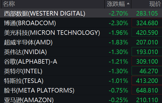 科技股多数下跌,西部数据、博通跌超2%,美光科技跌近2%,英伟达、英特尔、谷歌、特斯拉跌超1%。