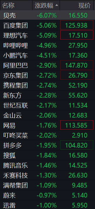 热门中概股全线下跌,纳斯达克中国金龙指数跌超2%,贝壳跌超6%,百度集团、理想汽车跌超5%,哔哩哔哩跌近5%,小鹏汽车跌超4%,阿里巴巴、京东集团、携程集团、新东方跌超2%。