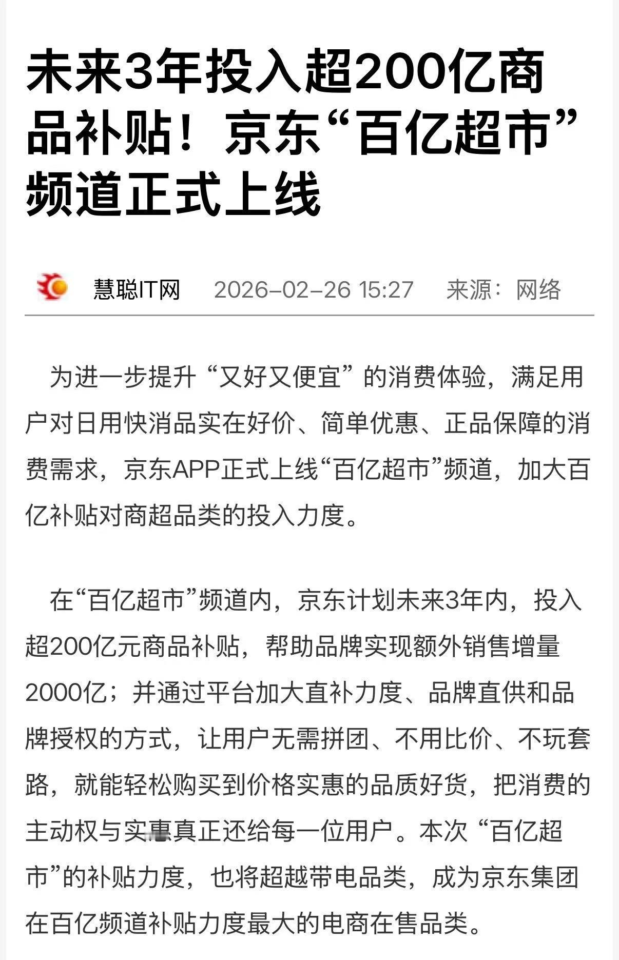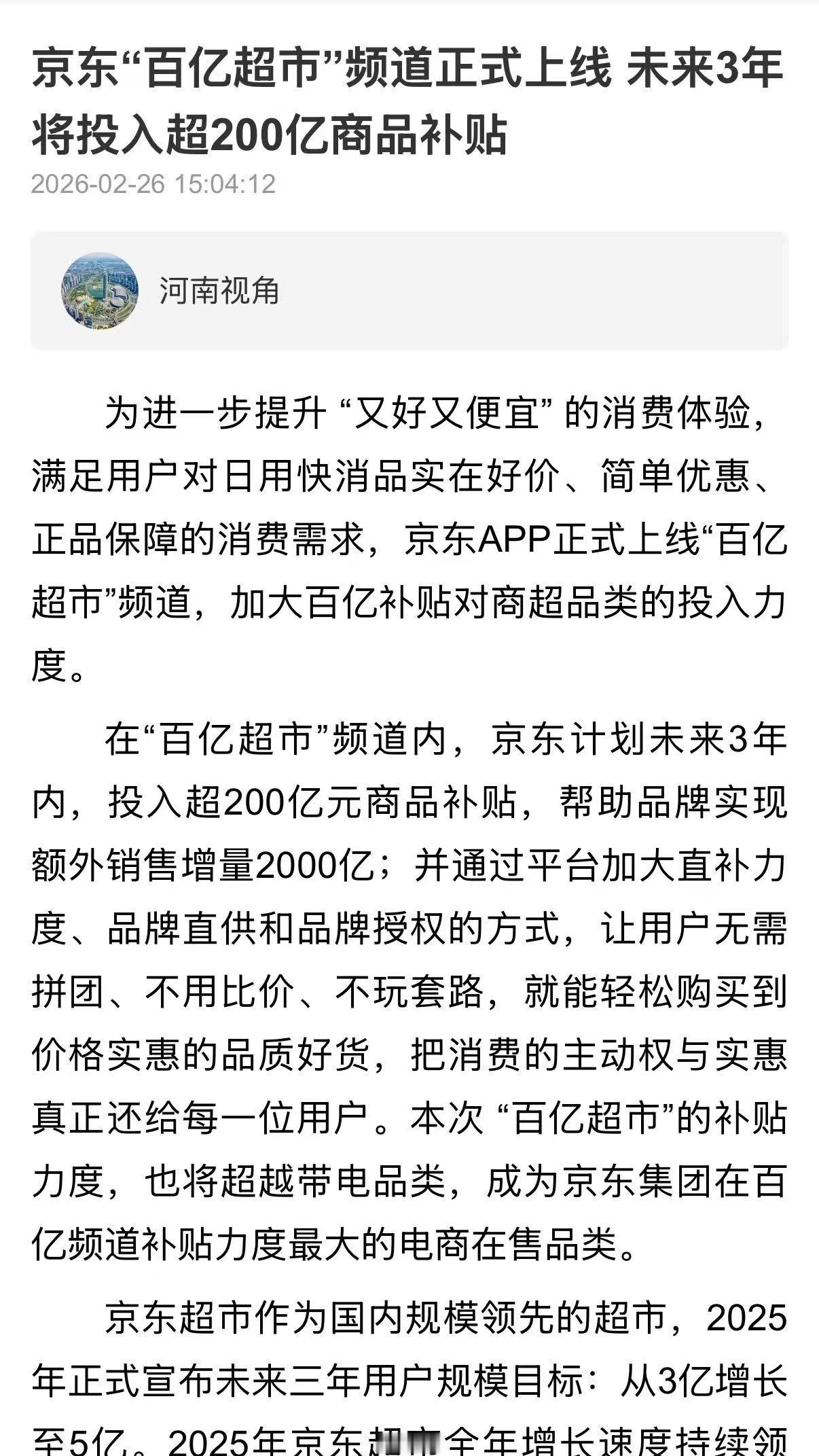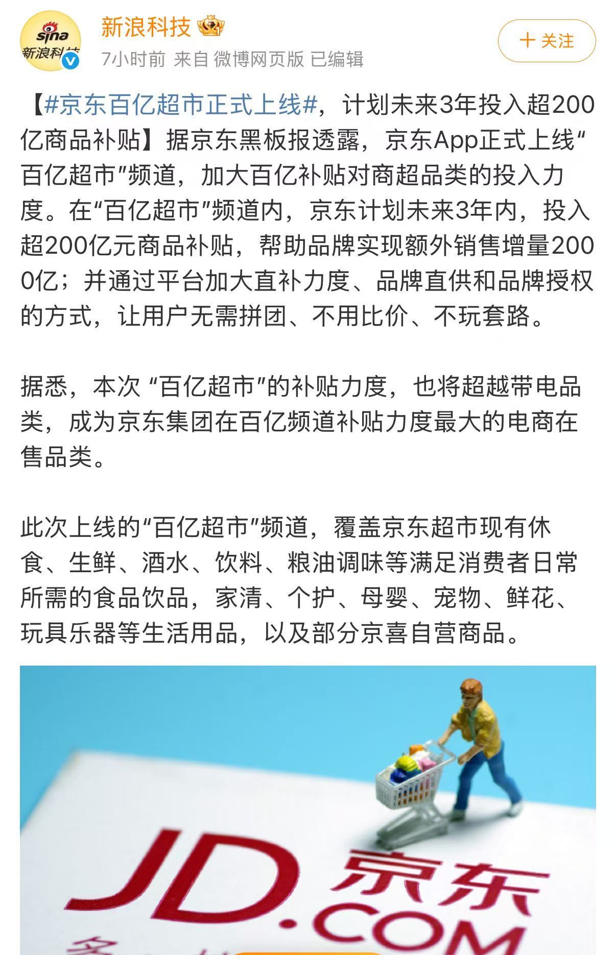 京东你是真的会!新上线的百亿超市频道也太懂打工人了吧,我刚看了官方消息,这次是真正加大百亿补贴对商超的投入,在“百亿超市”频道内,未来3年要砸超200亿商品补贴,帮品牌冲2000亿额外销售!刚入了一箱纯牛奶和纸巾,补贴完比超市买省了一半,还是官方直发保真!!速戳【网页链接】了解起来,日常刚需闭眼入不亏!京东百亿超市大补贴超便宜 京东百亿超市 又好又便宜