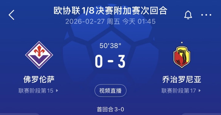 直播吧02月27日讯欧协联1/8决赛附加赛次回合,佛罗伦萨对阵乔治罗尼亚。