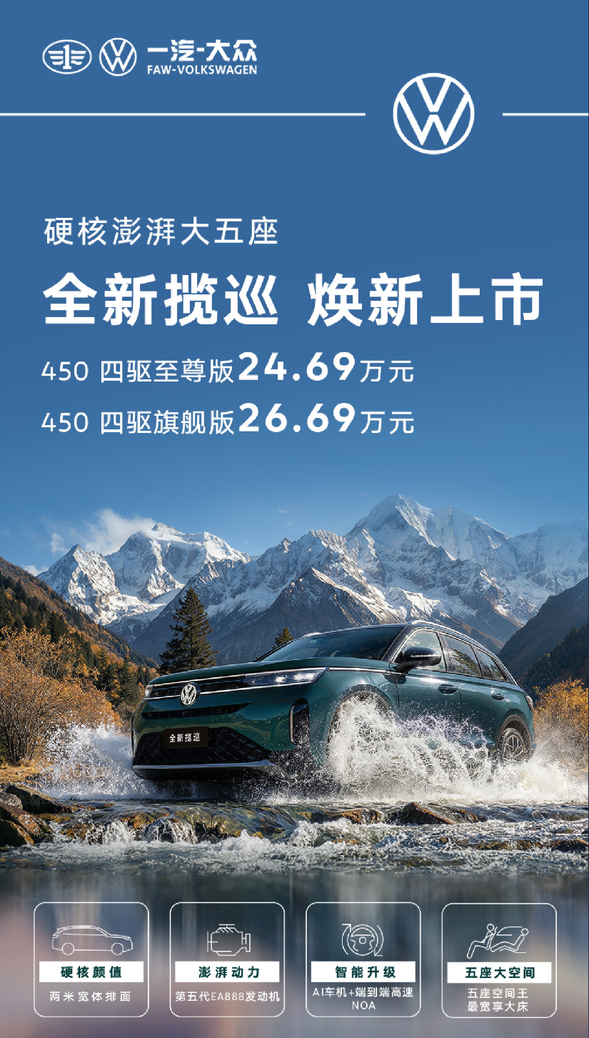在2026年的汽车市场,智能化不再局限于新能源阵营,一汽-大众全新揽巡以燃油身份强势切入高端智能座舱赛道。新车搭载四屏联动系统,整合15英寸2K中控、10.25英寸AR仪表、W-HUD及11.6英寸副驾屏,兼顾驾驶专注与乘员娱乐。座舱内部以横向简约设计营造开阔感,软包材质、双缝线工艺与透光饰条共同诠释轻奢美学。高通8155芯片保障系统流畅运行,IQ.语音精灵支持方言识别与全功能语音控制。定价24.69万至26.69万元,并推出七重购车政策,包括终身质保、免费代步车、高额置换补贴等,为追求品质生活的都市家庭提供兼具科技感与实用性的出行新选择。