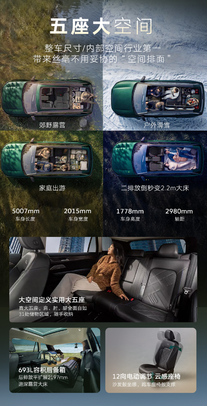 座舱质感与科技感同步拉满,内饰采用横向延伸简约线条,营造宽敞舒展的视觉效果。环抱式座舱全覆盖软质包覆,双拼孔皮与镀铬装饰搭配,双缝线与绗缝工艺提升精致感,触手可及之处均有细腻触感。仪表台与四门配备IMD透光饰条,可与氛围灯联动,白天呈现专属设计格调,夜晚点亮后营造温馨轻奢氛围。整车内饰化繁为简,摒弃冗余按键与复杂线条,以简约科技美学诠释未来轻奢出行理念,既满足年轻用户对科技感的追求,也契合家庭用户对舒适与质感的需求。