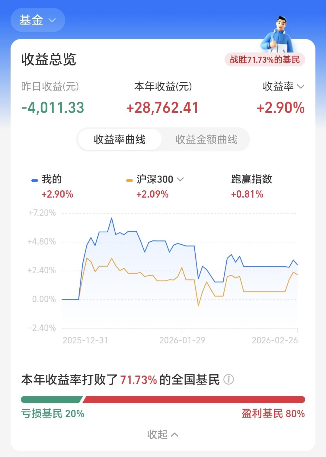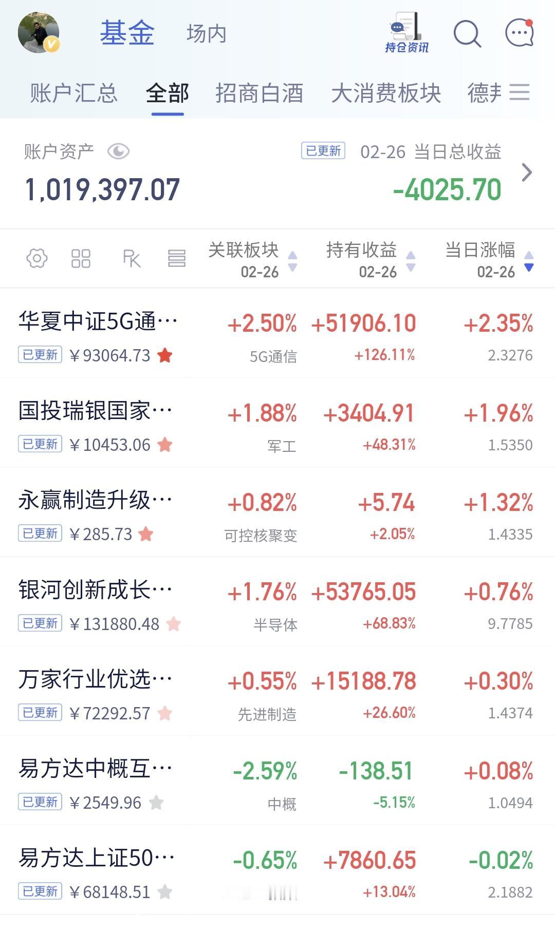 基金:近期市场存在着三个问题 昨天基金亏损4011元,基金持有1019549元,现金持有921699元,现金收益25元,资产总额1941248元,市场是波澜不惊的走势,资产是水波不惊的波动,但在这平静的背后,有可能会是波涛汹涌,就像有些少妇那样,紧裹的衣服里面,有可能是波澜壮阔。 本周有了三个交易日,一盈两亏,一个交易日盈利,两个交易日亏损,周盈利1574元。 本月有了13个交易日,五赢八亏,五个交易日盈利,八个交易日亏损,月亏损15236元。 今年以来收益28762元,收益率2.90%,跑赢了全国71.73%的基民,也跑赢了沪深300指数2.09%的上涨幅度。 近一年以来收益386013元,收益率27.70%,跑赢了沪深300指数19.37%的上涨幅度。 持有的基金中,昨天晚上净值更新以后,上涨幅度最大的三个板块是:5G板块,军工板块,可控核聚变板块,下跌幅度最大的三个板块是:新能源汽车板块,创新药板块,白酒板块。 欧洲市场昨天晚上上涨,法国上涨了0.72%,德国上涨了0.45%,英国上涨了0.37%,上涨幅度都不大。 美股市场昨天晚上涨跌不一,道琼斯指数上涨了0.03%,标普指数下跌了0.54%,纳斯达克指数下跌了1.18%,涨跌的幅度也都不大。 最近的市场存在着三个问题: 1:市场连续三个交易日放量,但指数并没有上涨多少,有放量滞涨的嫌疑。 2:外围市场,特别是香港市场的影响,昨天,香港市场大跌,昨天晚上,美股纳斯达克指数下跌幅度超过了1%,这些都会影响市场近期的走势。 3:现在上证指数和创业板指都是处于日线级别下跌通道上轨线上,也就是正处在压力位置上,所有下跌通道的上轨线都是压力位置,在压力位置附近,要么是上涨突破下跌通道的上轨线,要么是遇阻回落,从概率上讲,遇阻回落的概率会比突破的概率稍微大一些。 今天的支撑位置是4119点,第一压力位置是前天盘中最高4167点,第二压力位置是前高4190点,如果市场短线向好,今天需要放量站上4167点,但即使放量站上了4167点,也只是让我们推迟再一次止盈的时间,并不是我们可以进场的时间节点。 昨天市场上涨幅度最大的三个板块是:电网设备板块,cpo板块,通信板块,下跌幅度最大的三个板块是:创新药板块,储能板块,恒生科技板块。 CPO板块日线级别和周线级别都处于上涨通道中,上涨状态保持的很好,上涨通道内的涨跌都可以完全忽略,上涨通道内的涨跌都影响不了这个板块的上涨趋势,只要能够保持上涨趋势,短线的人以日线级别上涨通道的下轨线作为持有条件,长线的人以周线级别上涨通道的下轨线作为持有条件,只要不跌破上涨通道的下轨线,不管是短线的人还是长线的人,都可以继续持有。 有许多人问,既然处于上涨通道内,是不是就是随时随地可以上车?我认为不是这样的,能不能上车需要结合许多方面来综合判断,比如这个板块整体上的位置情况,处于上涨通道内的位置情况,是距离上涨通道上轨线更近一些,还是距离上涨通道下轨线更近一些,更重要的还有整体市场的情况,像现在市场整体上处于震荡走势,在方向不明的情况之下,不管什么样的板块都不要轻易上车。 今天市场会微微低开,今天的走势有点重要,最近的走势也都重要,决定了我们要不要进行再一次止盈,决定了我们在什么时候进行再一次止盈,有观点以后,我会第一时间分享给大家。 花1秒钟点赞,花30秒钟评论,就是对我最大的支持,谢谢大家的支持。