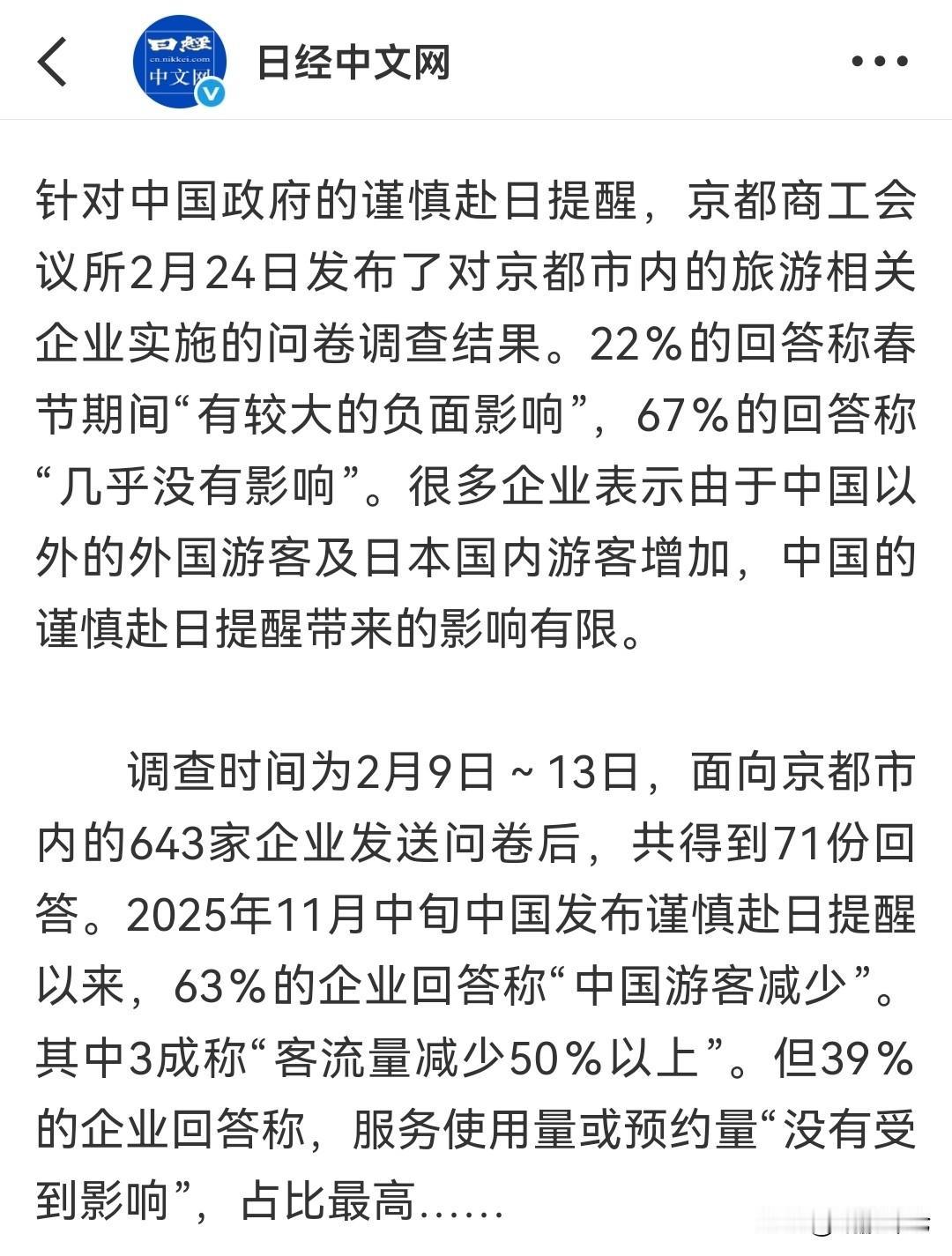 日本媒体嘴还是很硬的 日经报道,67%的京都旅游企业认为:中国赴日提醒春节期间几无影响,只有22%的认为有较大负面影响。 既然面对中国的反制,日本没输,那么下一步是什么? 推动修宪?在琉球部署导弹?继续和中国对抗?