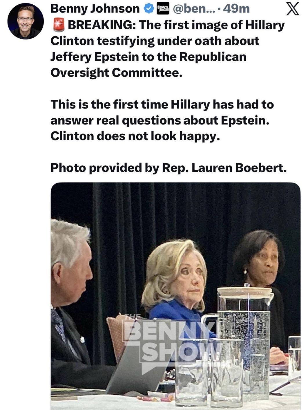 美国众议员劳伦·博伯特Lauren Boebert再次坚持泄露希拉里·克林顿在闭门爱泼斯坦听证会上一张神情震惊的照片。 记者:“你为什么要发这张照片?” 博伯特:“为什么不呢?!”
