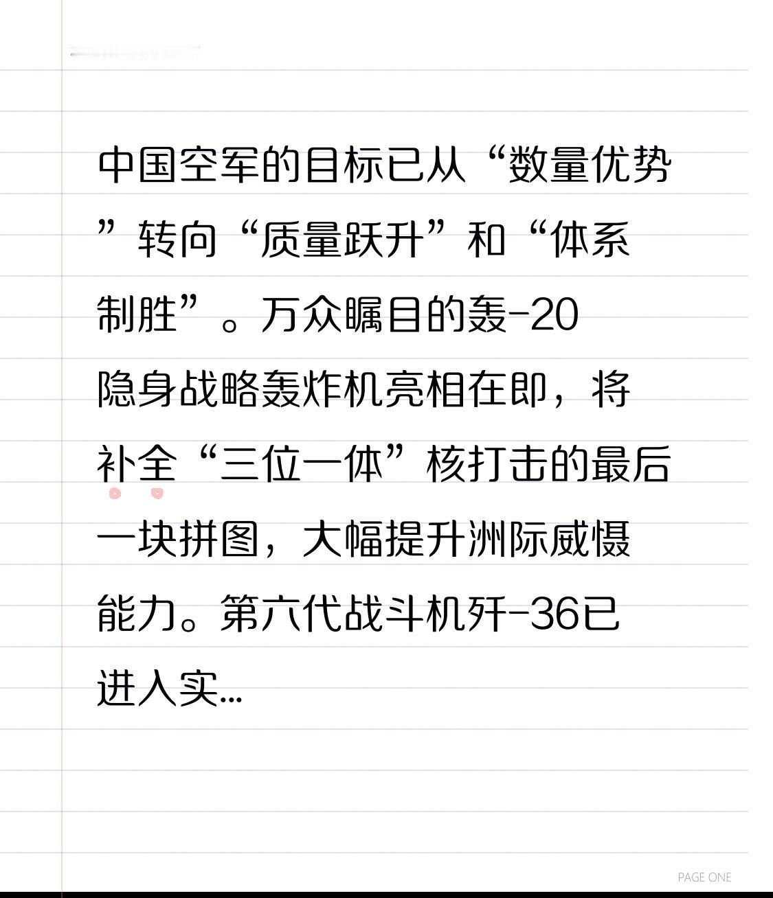 中国空军的目标已从“数量优势”转向“质量跃升”和“体系制胜”。万众瞩目的轰-20
