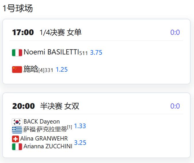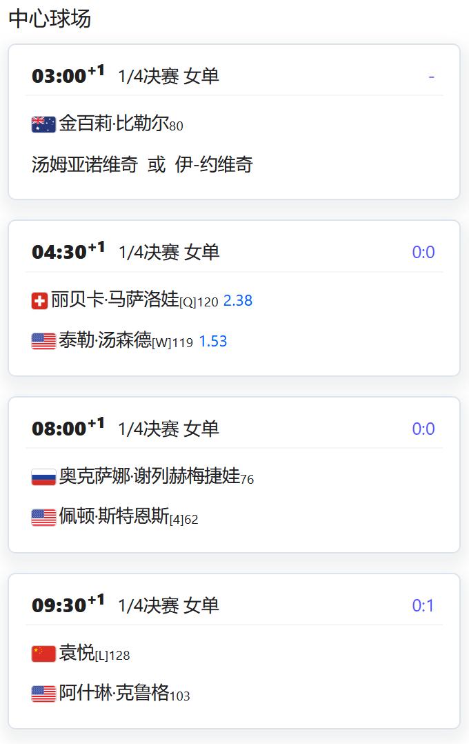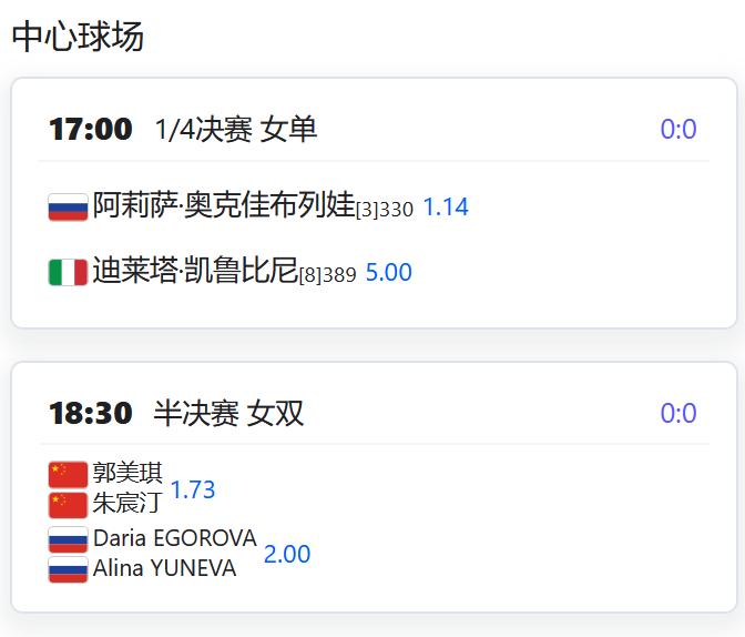 赛果: WTA500赛梅里达站,女双四分之一决赛,蒋欣圩/布克沙6-2,6-3击败对手,晋级四强; 徐一璠/汤千慧6-4,6-0击败圣玛利亚/德西乌克,同样晋级四强; 赛程: WTA500赛梅里达站,女单第二轮,张帅将对阵2号种子卫冕冠军纳瓦罗; WTA250赛奥斯汀站,女单四分之一决赛,袁悦将对阵克鲁格; W35莫纳斯提尔,女单四分之一决赛,施晗将对阵一名意大利球员; 小将孙心然将对阵6号种子贝内曼; 女双半决赛,郭美琪/朱宸汀对阵一对俄罗斯组合。