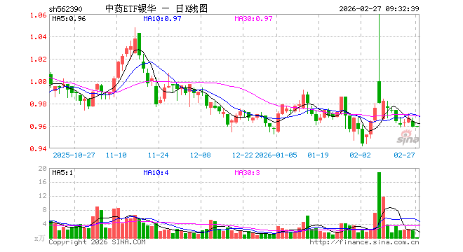 2月27日,中药ETF银华(562390)开盘涨0.10%,报0.960元。中药ETF银华(562390)重仓股方面,云南白药开盘跌0.11%,片仔癀涨0.12%,东阿阿胶涨0.02%,同仁堂跌0.03%,华润三九涨0.03%,吉林敖东涨0.00%,白云山涨0.00%,以岭药业涨0.00%,达仁堂涨0.00%,众生药业涨0.05%。