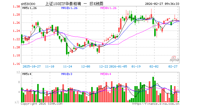 2月27日,上证180ETF华泰柏瑞(530300)开盘跌0.24%,报1.265元。上证180ETF华泰柏瑞(530300)重仓股方面,贵州茅台开盘涨0.05%,紫金矿业跌0.43%,中国平安涨0.16%,恒瑞医药跌0.18%,药明康德跌0.13%,寒武纪跌2.03%,招商银行涨0.13%,长江电力涨0.04%,工业富联跌2.85%,中芯国际跌1.39%。