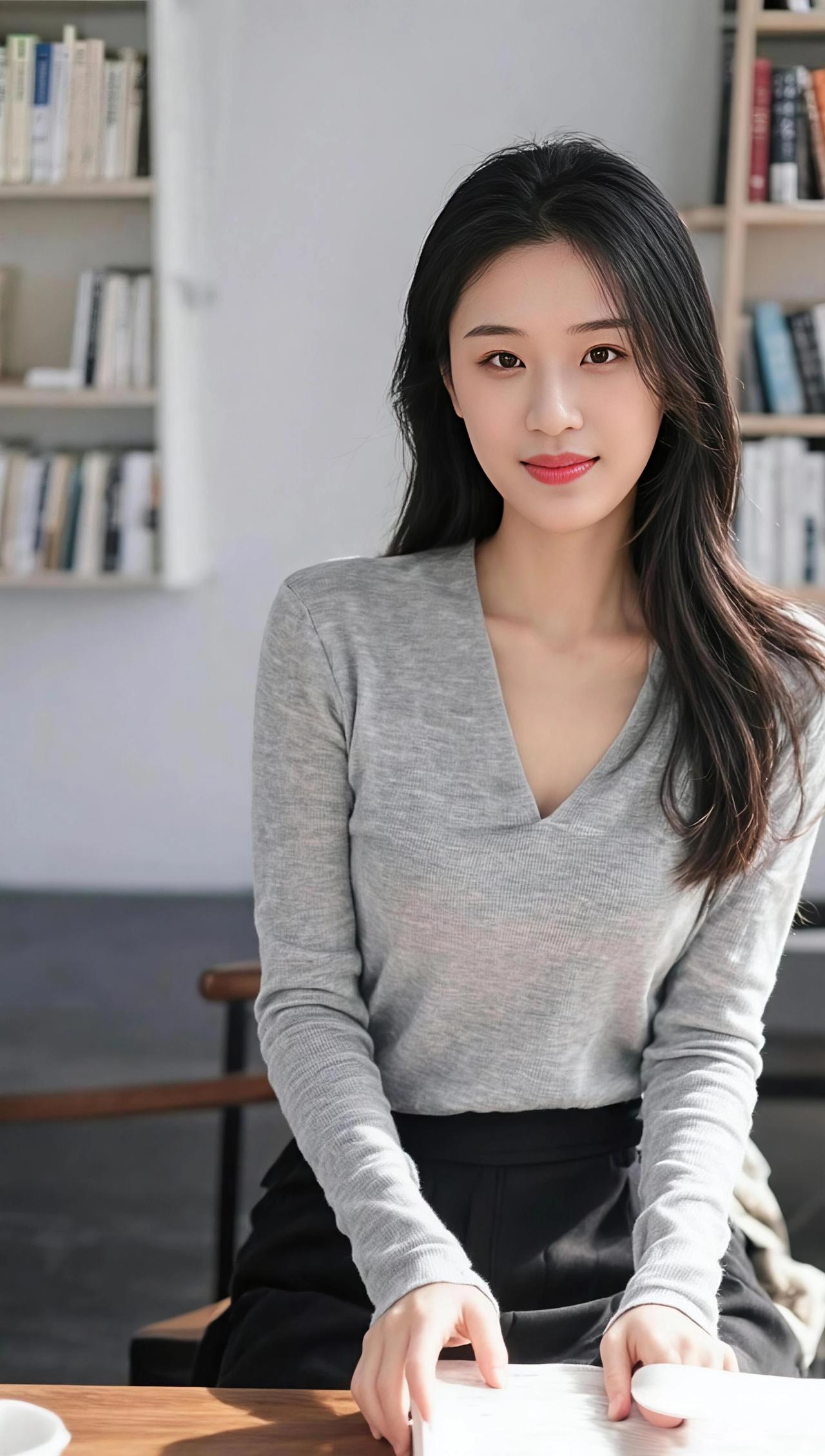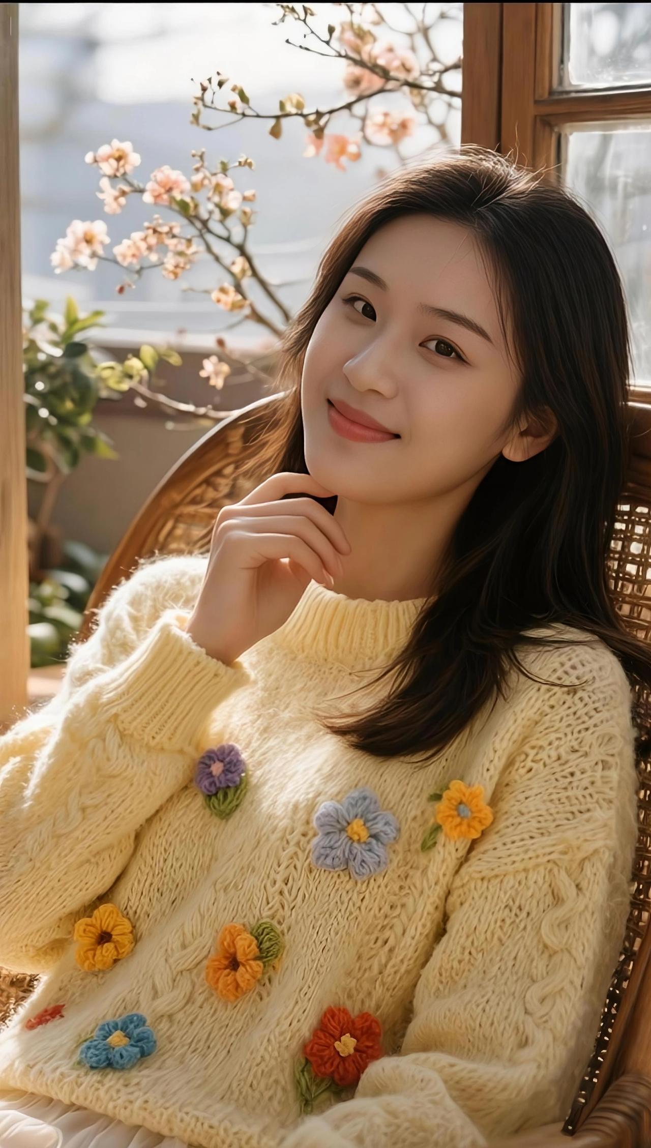 窗畔晴光落素衣, 蓝衫叠暖映清辉。 眉弯浅漾春风意, 眸底深藏静者机。 抱臂凝思云影淡, 凭栏浅笑日光微。 人间多少尘嚣事, 不及檐前一息归。 女性应有的气质 女性气质 风从窗缝溜进来 掀动毛衣的绒线 也掀动你眼底的光 蓝衬衫的领角 像一片刚洗过的天 裹着午后的软 你把手臂叠成一座桥 桥那头是未说的话 桥这头是我停住的目光 窗外的树影在晃 像有人在纸上 轻轻描着时光