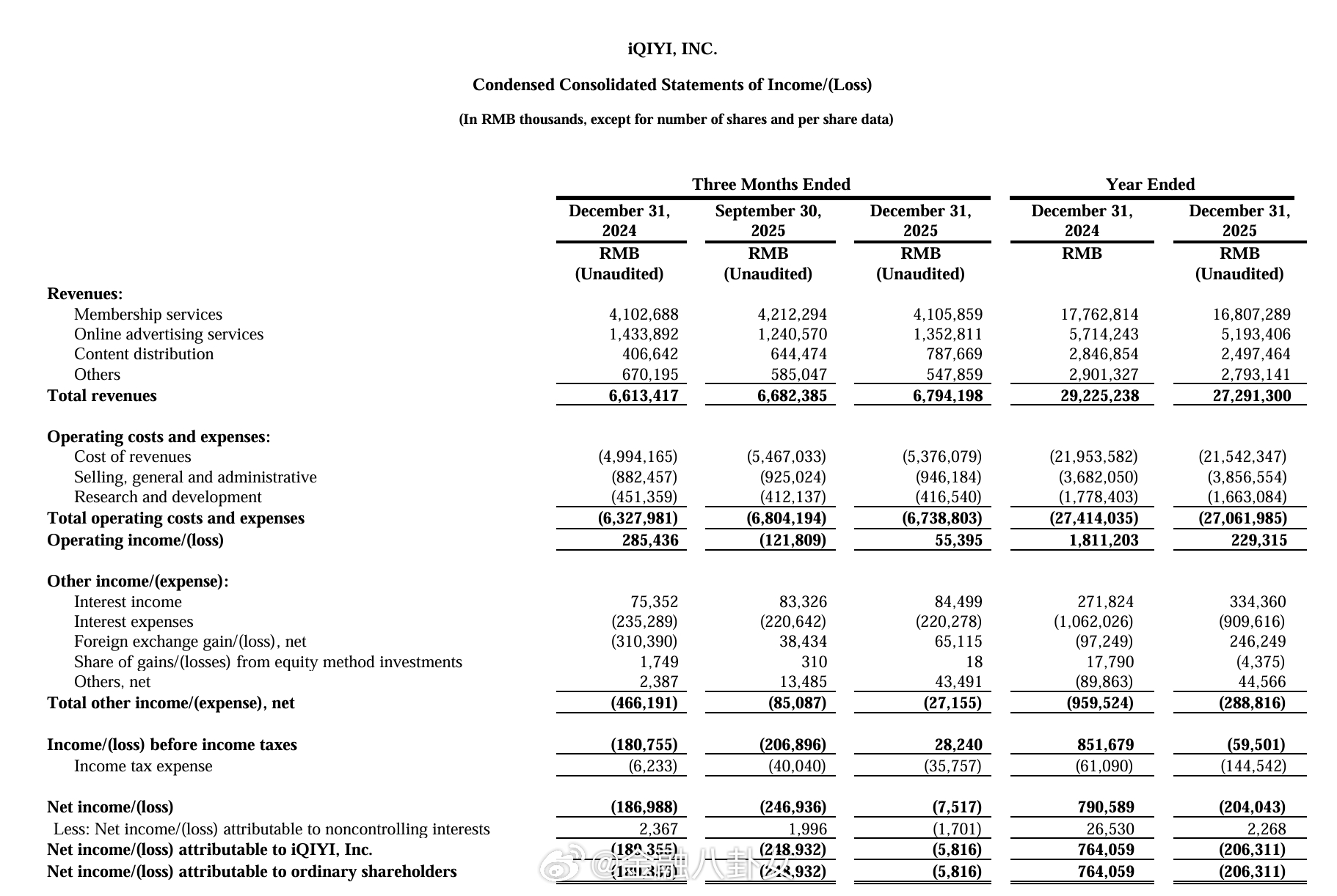 爱奇艺利润额缩水73%!会员跑了,广告少了爱奇艺发布2025全年财报