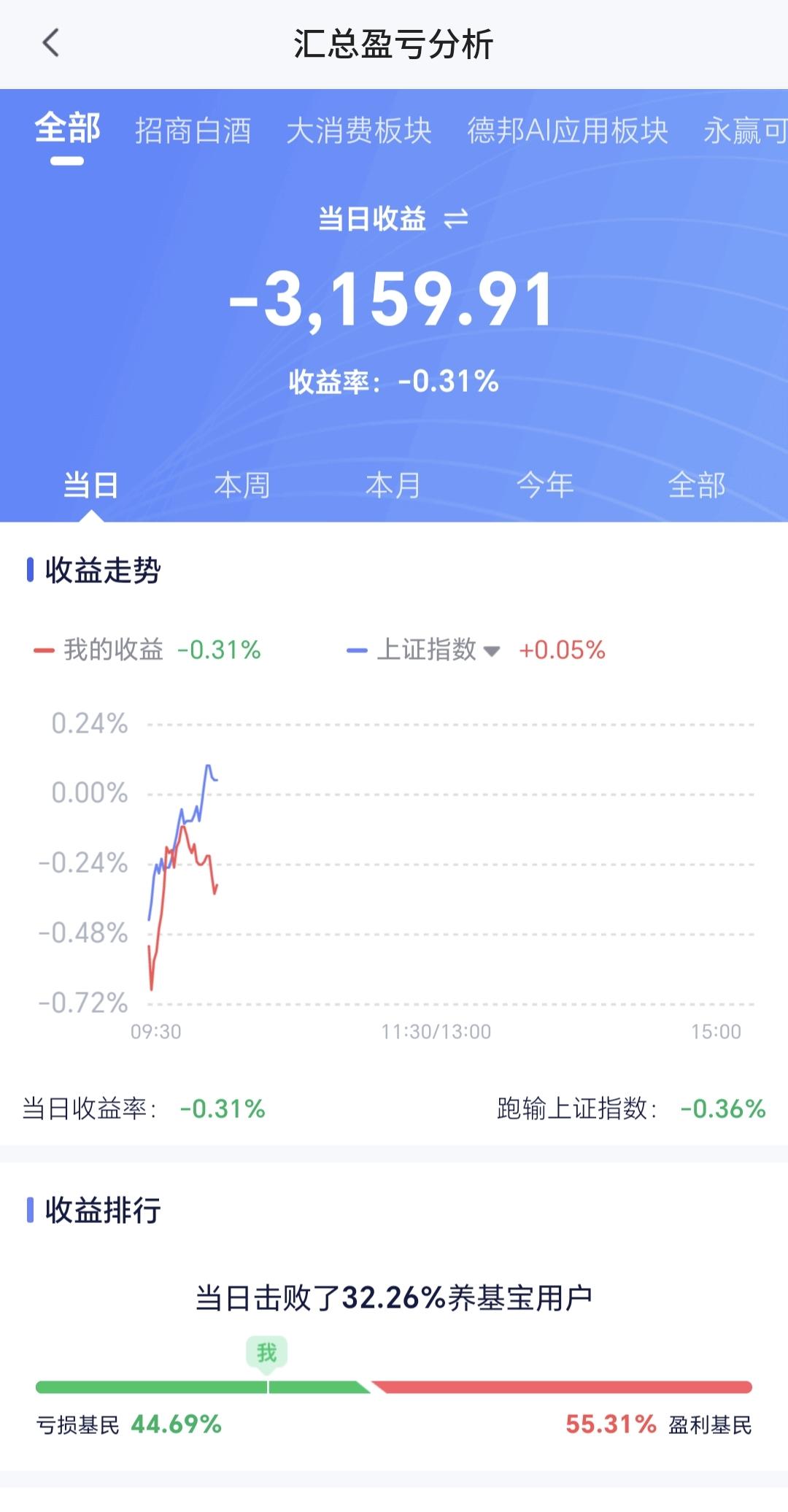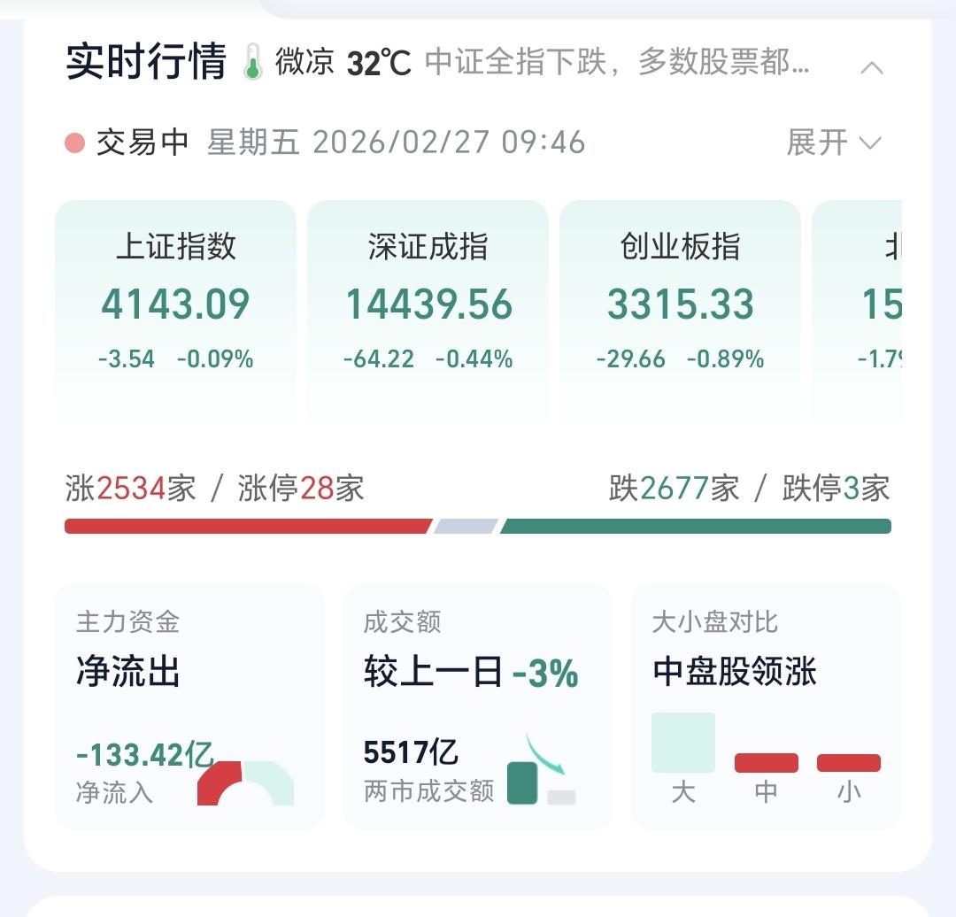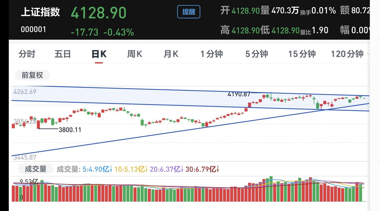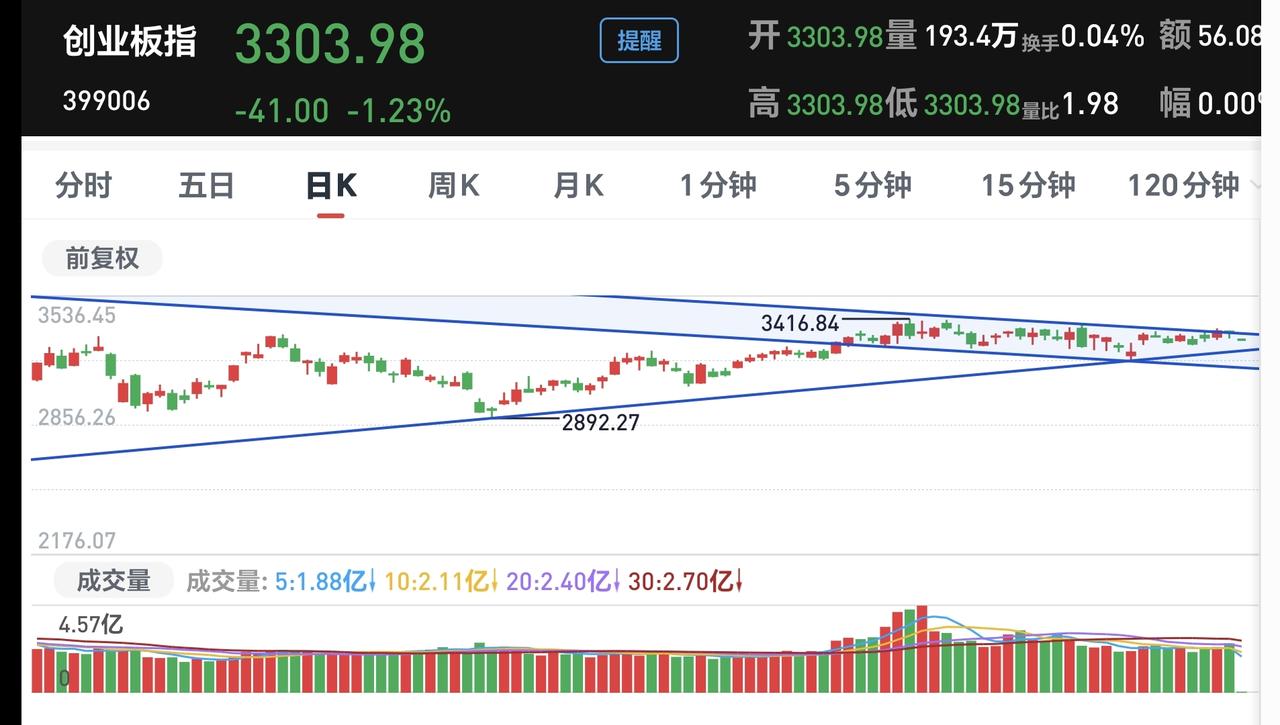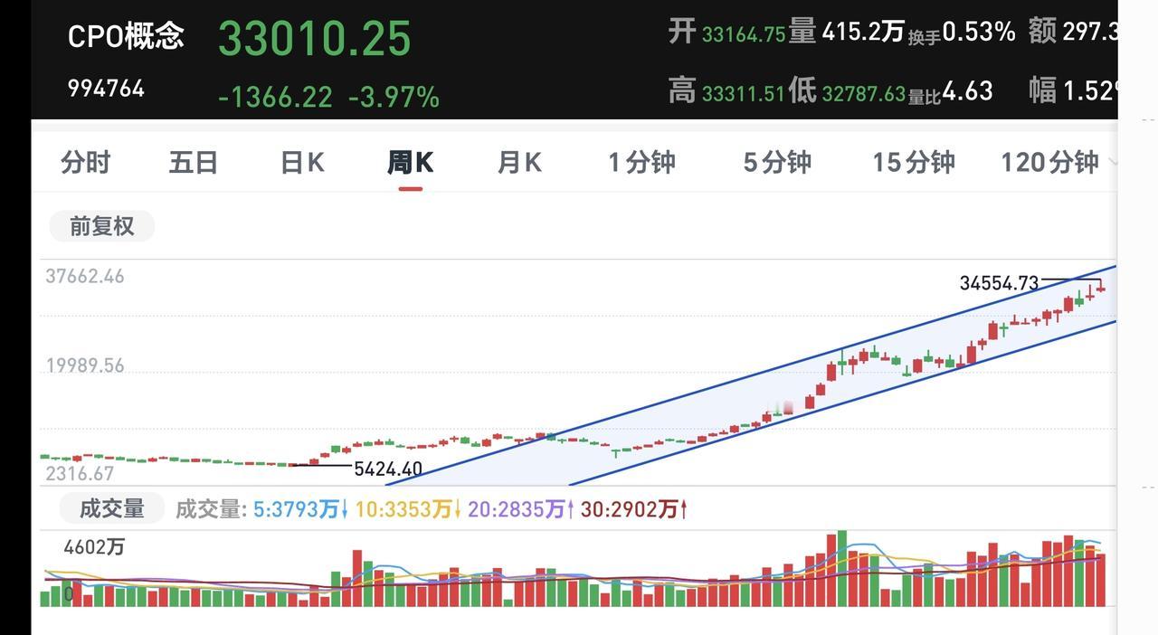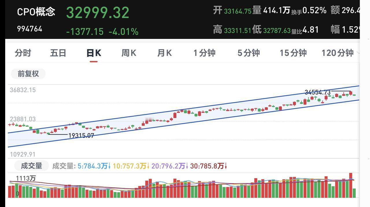 基金:Cpo板块大跌,是进场还是离场 今天市场低开,三大指数都是低开,创业板指开盘下跌了1.23%,开于3303点,上证指数开盘下跌了0.43%,开于4128点。 看下面的截图2和3,这是上证指数和创业板指的日K线图,现在它们都是处于日线级别短期下跌通道内,与下跌通道的上轨线都比较近,近期观察是继续在下跌通道内运行,还是能够上涨突破这个下跌通道的上轨线。 开盘以后指数震荡向上,三大指数的下跌幅度都已经缩小,黄色线在蓝色线上方,但两条线之间的敞口不大,第一个15分钟两市累计成交5517亿,相比于昨天同期缩量了3%,上涨2500多家,下跌2600多家,下跌家数稍微多于上涨家数,涨停28家,跌停3家,主力资金净流出133亿。 整个市场主力资金净流入最多的三个板块是:计算机板块,软件开发板块,软件板块,主力资金净流出最多的三个板块是:高端制造板块,电子板块,大科技板块。 整个市场上涨幅度最大的三个板块是:稀土永磁板块,钢铁板块,黄金板块,下跌幅度最大的三个板块是:Cpo板块,半导体材料板块,半导体板块。 CPO板块今天大跌,板块下跌了3.29%,这个板块的持有人数在所有板块当中排名第二位。 看下面的截图11,这是cpo板块日K线图,今天虽然大跌,但还是处于日线级别上涨通道中,并没有跌破上涨通道的下轨线,今天下跌并没有改变日线级别的上涨趋势,短线持有的人可以继续持有,只有跌破别上涨通道下轨线的时候,短线持有的人才考虑要不要止盈出来观望。 看下面的截图12,这是cpo板块周K线图,这个板块周线级别也是处于上涨趋势中,今天的下跌也没有改变周线级别的上涨趋势,长线持有的人可以继续持有,周线级别上涨通道的下轨线是长线持有者的持有条件,当跌破周线级别上涨通道下轨线的时候,长线持有者再考虑要不要止盈出来观望。 Cpo板块日线级别和周线级别都是处于上涨通道中,持有的人可以继续持有,但现在处于相对高位,大盘的方向也存在不确定性,这个时候不建议进场,只建议持有。 最近的市场就是板块轮动的行情,市场大盘震荡的情况之下,板块的轮动是非常快的,俗称电风扇行情,这样的情况之下,最忌讳的就是追涨杀跌,当你追涨进去的时候,它开始了下跌,当你杀跌出来的时候,它又开始了上涨,结果是两头挨打。 持有基金现在盘中估值亏损了3159元,盈利金额最大的三个板块是:创新药板块,大消费板块,证券板块,亏损金额最大的三个板块是:芯片半导体板块,创业板指,先进制造板块。 今天的市场虽然是低开,但黄色线在蓝色线上方,低开高走的概率是比较大的,由于成交量还是萎缩的高,走的高度就受到了限制,大概率还是一个震荡的走势,收盘的时候小阴小阳的可能性比较大。 现在的位置处于市场相对的高位,这个时候能不能突破前高4190点就显得很重要,即使能够突破这个点位,以什么样的方式来突破也是很重要,如果没有成交量的配合,再加上突破的力度不大,突破以后大概率会形成大级别的高点,但如果以很快的速度突破4190点,而且有成交量的配合,形成高点的时间节点就要向后推离,我们这一次止盈的时间也就要推后,最近我会密切观察市场的走势,有观点以后会第一时间分享给大家。 花1秒钟点赞,花30秒钟评论,就是对我最大的支持,谢谢大家的支持。