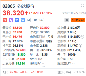 上证报中国证券网讯(李子健记者周亮)2月27日,太空光伏概念再度走强,钧达股份H股股价走高。截至10时43分,钧达股份上涨17.91%,报38.32港元/股,盘中一度涨超18%。钧达股份A股涨停。