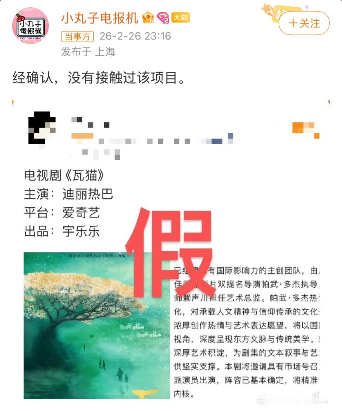迪丽热巴对接辟谣出演瓦猫迪丽热巴 瓦猫迪丽热巴对接发文辟谣出演《瓦猫》:“经确认,没有接触过该项目。” 迪丽热巴方辟谣瓦猫