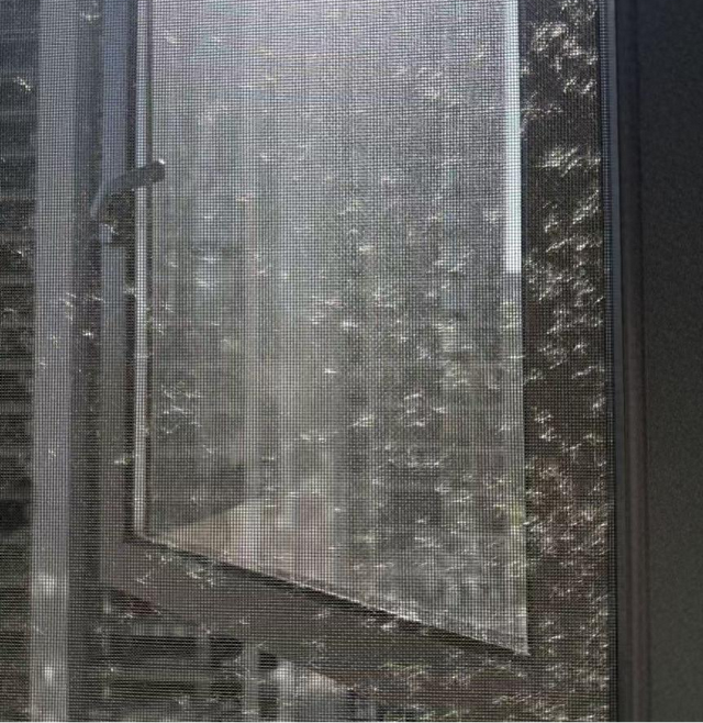 大量芦苇絮粘在纱窗上
