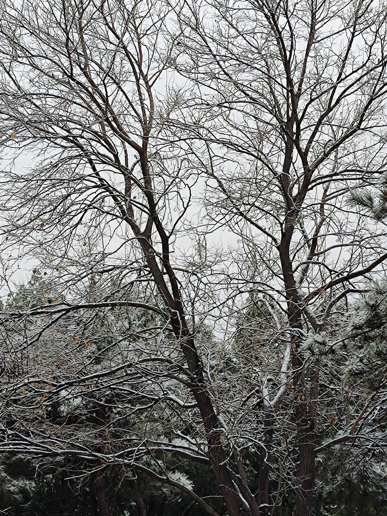 昨晚北京一场雨雪,感觉不小,早上开车有的路段还有积水,公园雨后雪落形成树挂,算作
