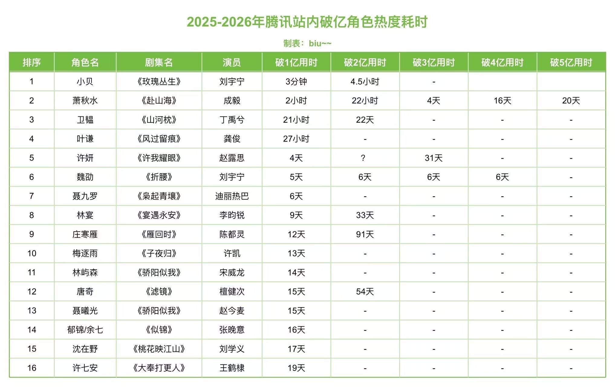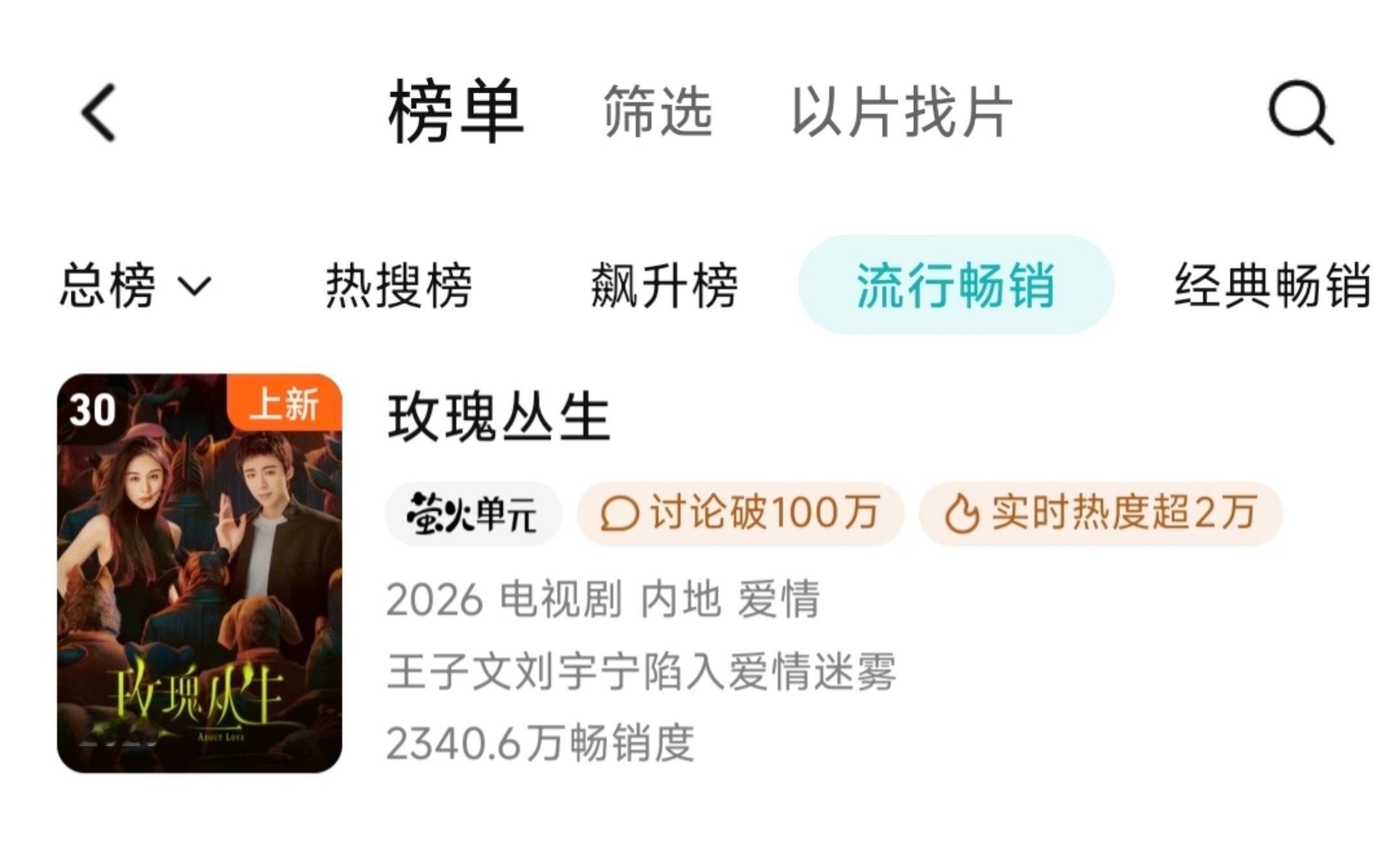 刘宇宁新剧《玫瑰丛生》开局19广开播:1️⃣2026萤火单元首播年冠2️⃣角色热度破1亿速度史冠(3分钟)3️⃣角色热度破2亿速度史冠(4小时)4️⃣2026年站内角色热度第一(11分钟)5️⃣开播首日进周榜,腾讯拉新年季不论古今剧集题材全部高开🔥刘宇宁扛剧扛招商扛热度🔥刘宇宁用角色证明扛剧实力