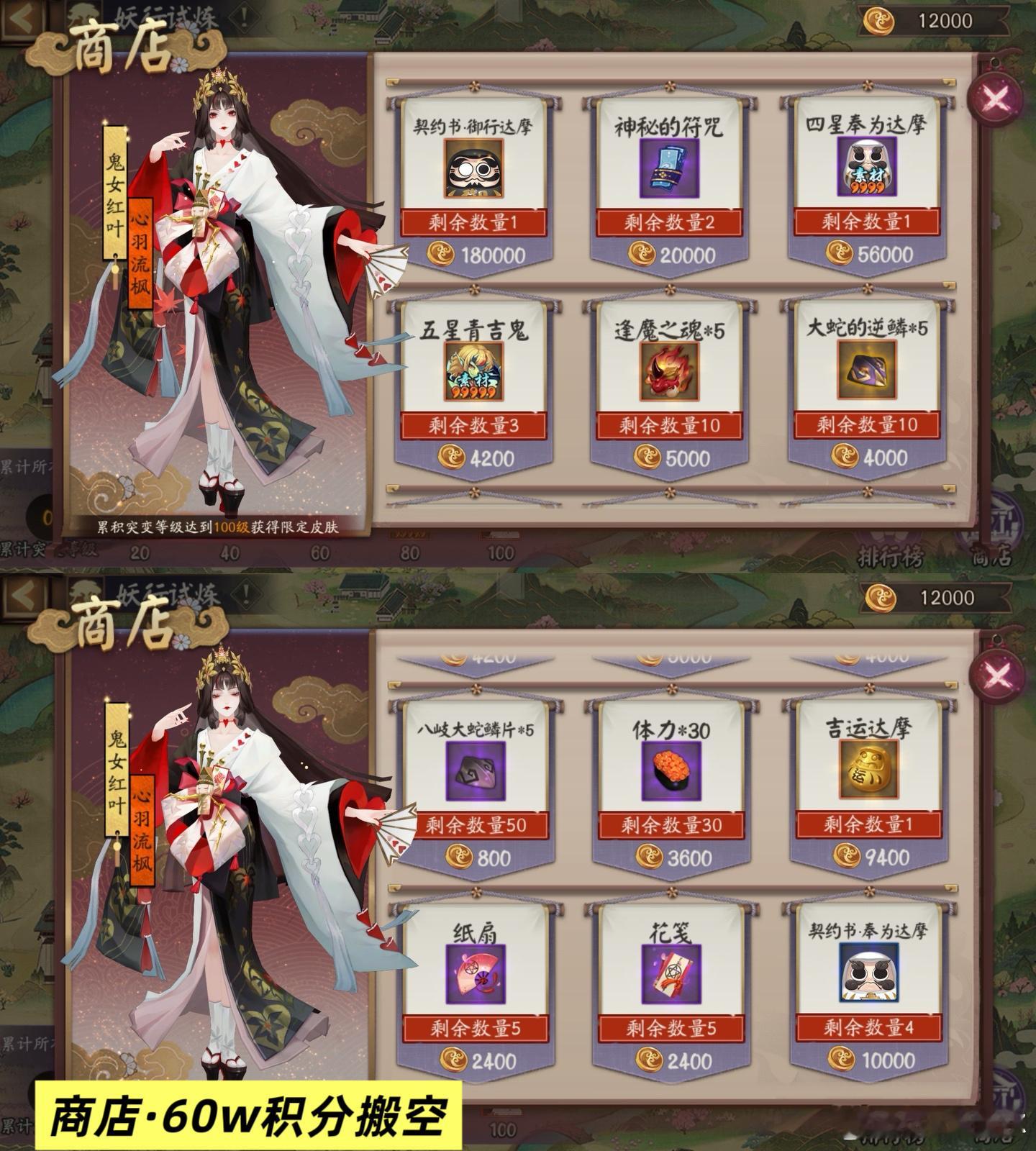 阴阳师手游超话创作官阴阳师马年春节版本 【妖行试炼】玩法+活动前瞻+奖励计算■3.4或3.6(周三或周五)开启活动,活动持续10天,每2天解锁1个新BOSS■玩法:①挑战BOSS,得商店积分(每日前10次可得积分)②选择突变难度,挑战难度升级的BOSS,累计100级突变可领取红叶皮肤