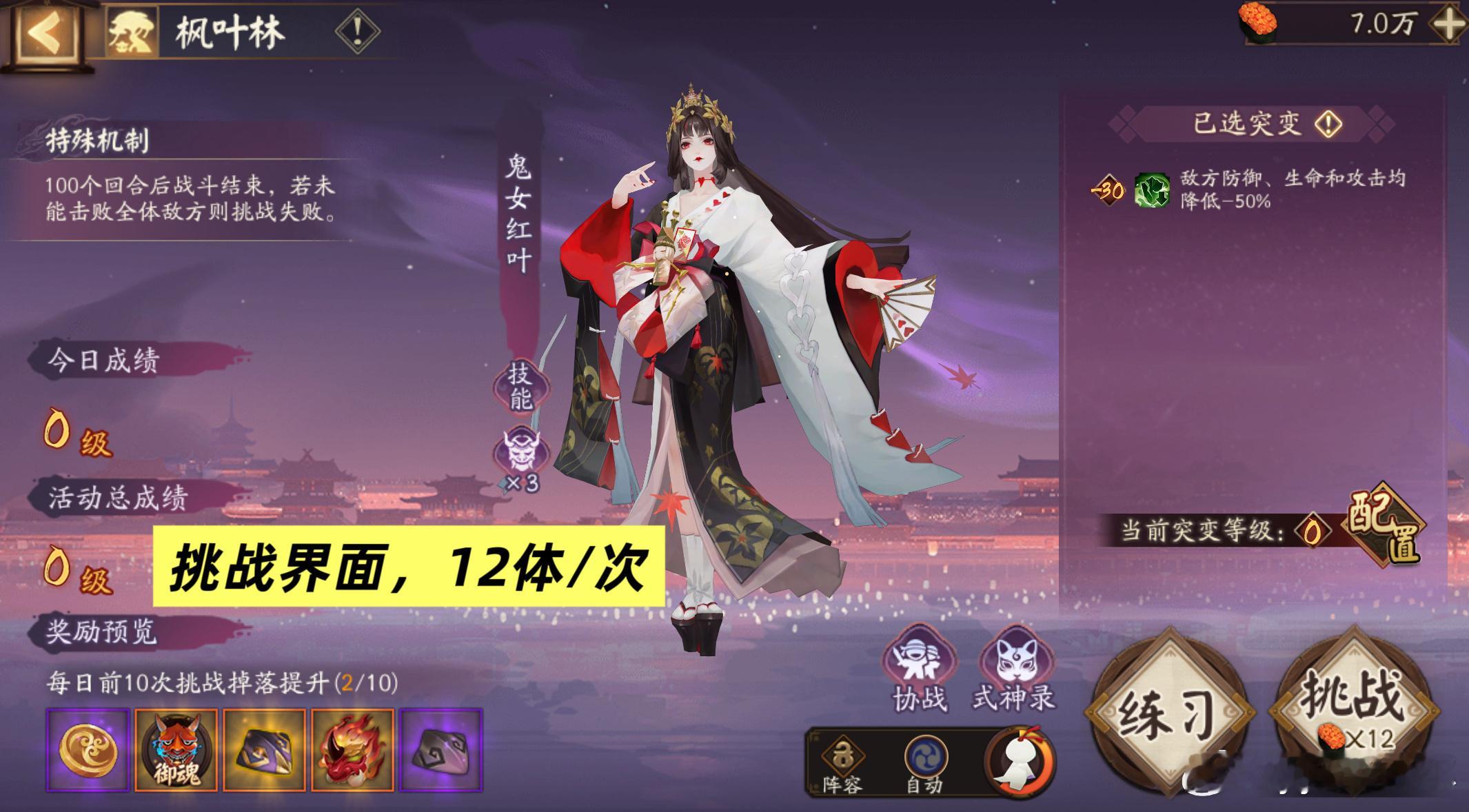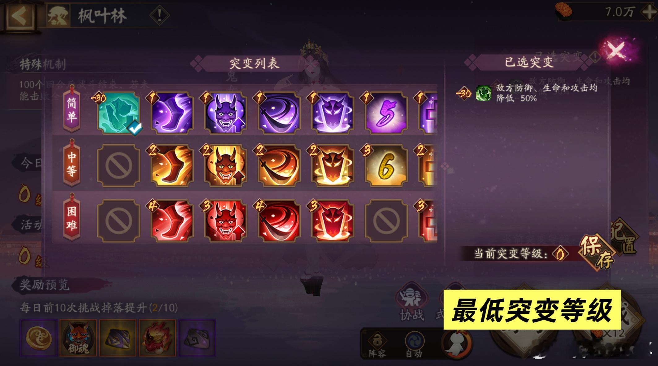 ■关于突变①最低负30(方便低配玩家拿商店积分),最高45级难度②突变等级越高,BOSS难度越大,但不影响奖励③想拿到皮肤奖励,每个地点平均要挑战20级突变的难度④每次挑战消耗12体,每日最多挑战100次⑤活动可借式神,没有排行榜,挑战前可以先练习一下,避免浪费体力、浪费挑战次数