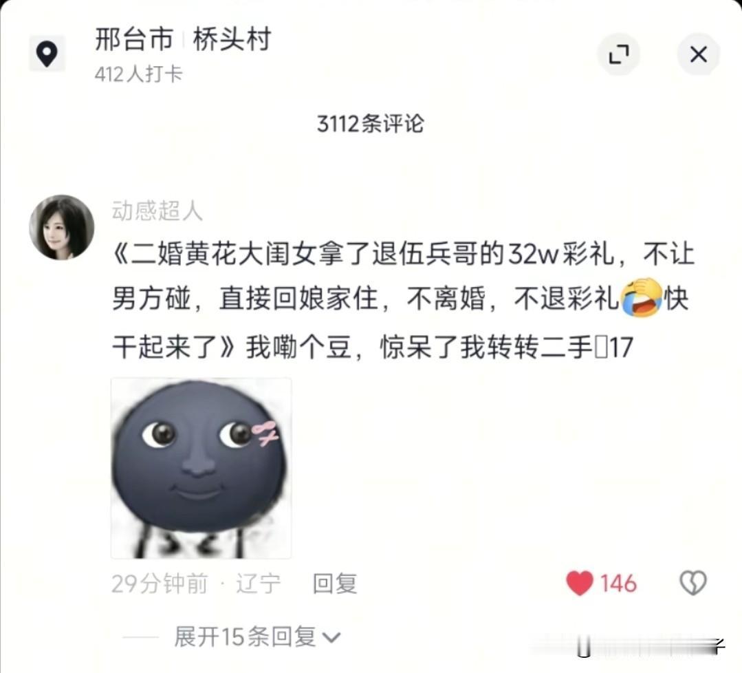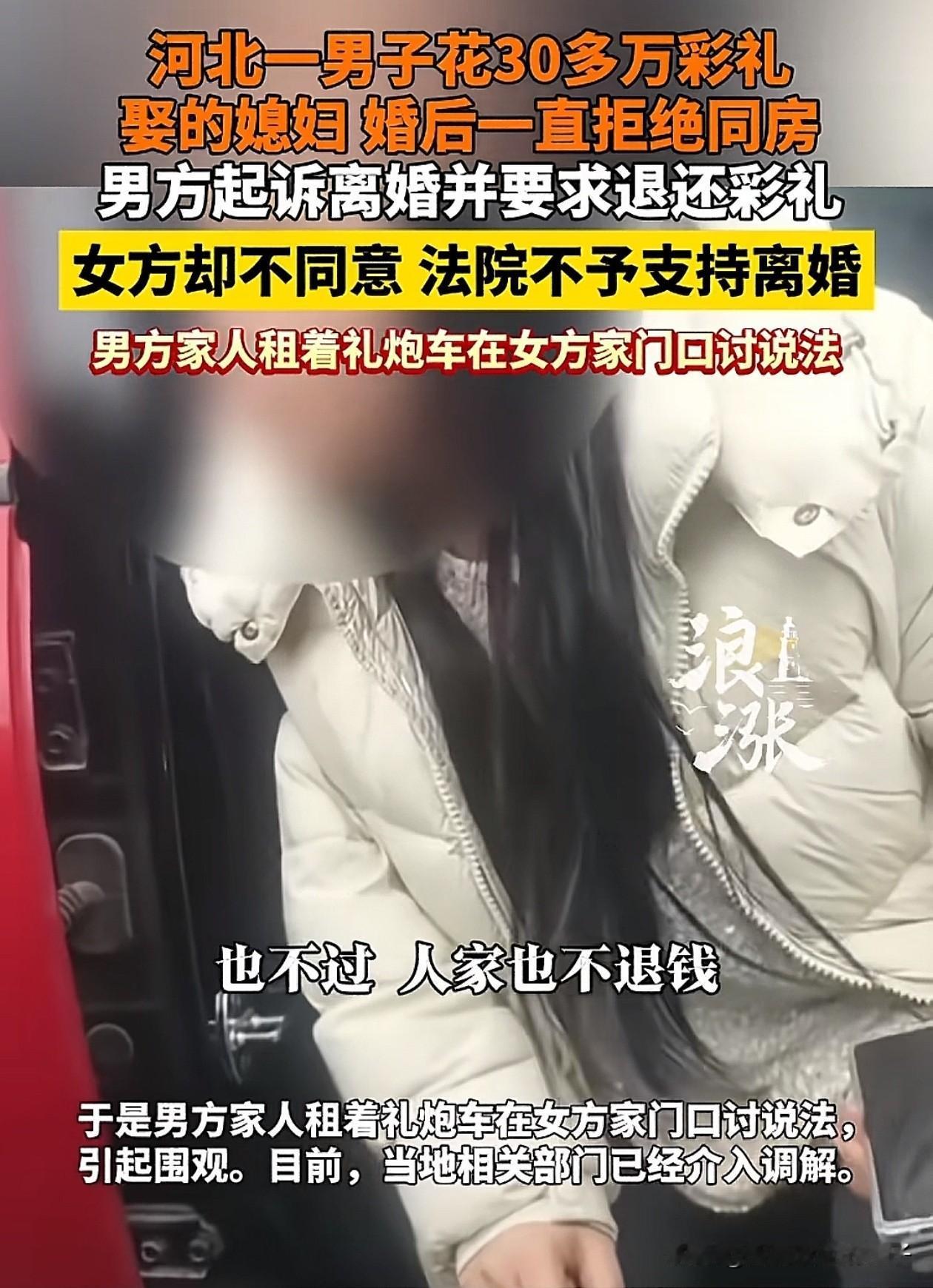 太离谱了!河北邢台,男子花30万元娶的媳妇,结婚10个月都没同房,连换衣服都要背着小伙,两人吵架后,女子直接回了娘家,也不离婚,就这样拖着。 于是小伙到法院起诉离婚,但是因女方不同意,且证据不足被驳回了! 小伙家人想不通,于是租了一辆礼炮车到对方家里讨说法,现场双方各执一词,引起很多人围观,女子说她被家暴,导致患上抑郁症,彩礼已经花完了。 男方家属则表示,小伙为了结婚,已经掏空了家底,连小伙的退伍费都拿出来了,如今人财两空,必须给个说法。 目前当地相关部门已经介入调解,希望能有个好的结果,其实能理解小伙的委屈,花这么多娶个媳妇,连手都牵不上,换谁来也无法接受! 让人无法理解的是,既然不喜欢,为啥不愿离婚呢,这样拖着只能是互相伤害!
