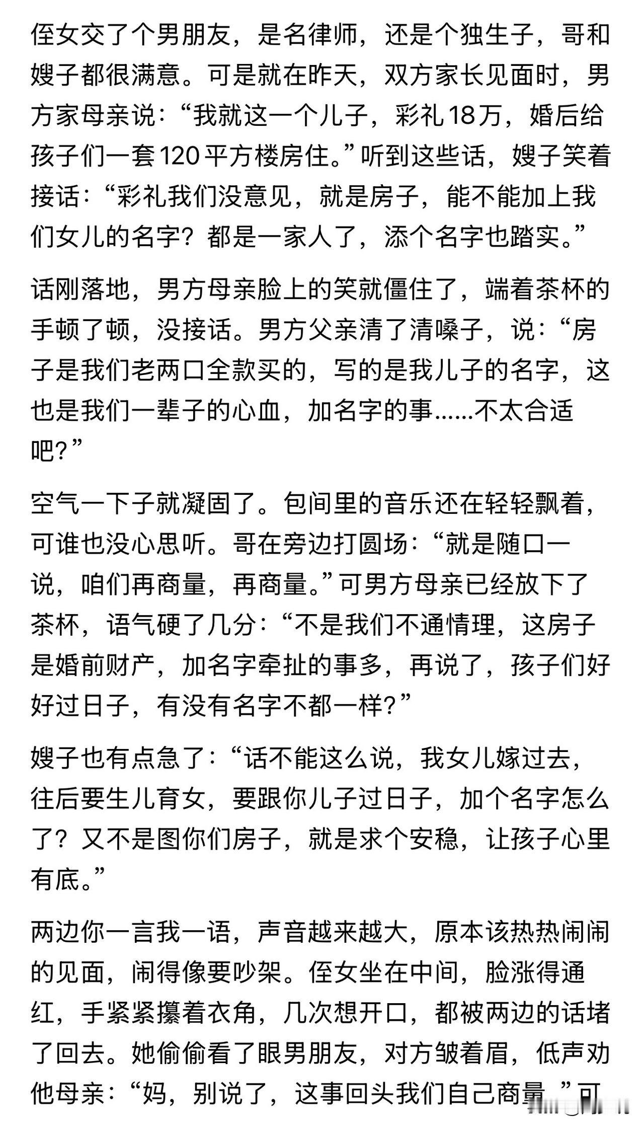 “家长见面因房产加名闹僵!”近日,一网友分享自家侄女的相亲婚事,引发全网热议。侄女交往了律师独生子男友,两家家长见面本是喜事,男方父母坦言婚房是全款婚前财产,女方妈妈随口提出加名求踏实,却让气氛直接凝固。男方家长坚决不肯,觉得是自家一辈子心血,女方妈妈委屈反驳,只为女儿婚后有保障,双方越吵越僵,好好的见面不欢而散。侄女夹在中间左右为难,一边是疼自己的父母,一边是对自己不错的男友,躲在房间哭到吃不下饭。 这事在网上曝光之后,也是引发网友议论纷纷。有网友当即表示:“女方要的不是房子,是安全感。男方护的不是财产,是心里的顾虑”。 也有人认为:“家长太强势,反而苦了孩子”。 其实这件事,周少觉得真的没必要非黑即白。可以说,很多家庭谈婚论嫁,都卡在房产证加上名字这道坎上。 女方父母怕女儿嫁过去受委屈,想抓一份保障,没错;男方父母攒钱买房不易,担心财产纠纷,也能理解。可偏偏忘了,婚姻的根基从来不是一张房产证。 当然,这事也得夸夸这位侄女,能很快想通,并决定主动和男友沟通,不图房子,只求彼此体谅,也希望男友懂自家父母的心意。 其实,年轻人的婚姻,终究要自己做主。房子再大,填不满人心的隔阂;名字再响,比不上两个人同心同德。 家长不妨少一点固执,多一点换位思考,别让物质,冲淡了本该有的亲情和爱意。这才是婚恋里,最该教给孩子的道理。#寻美三湘# #周少说教育#