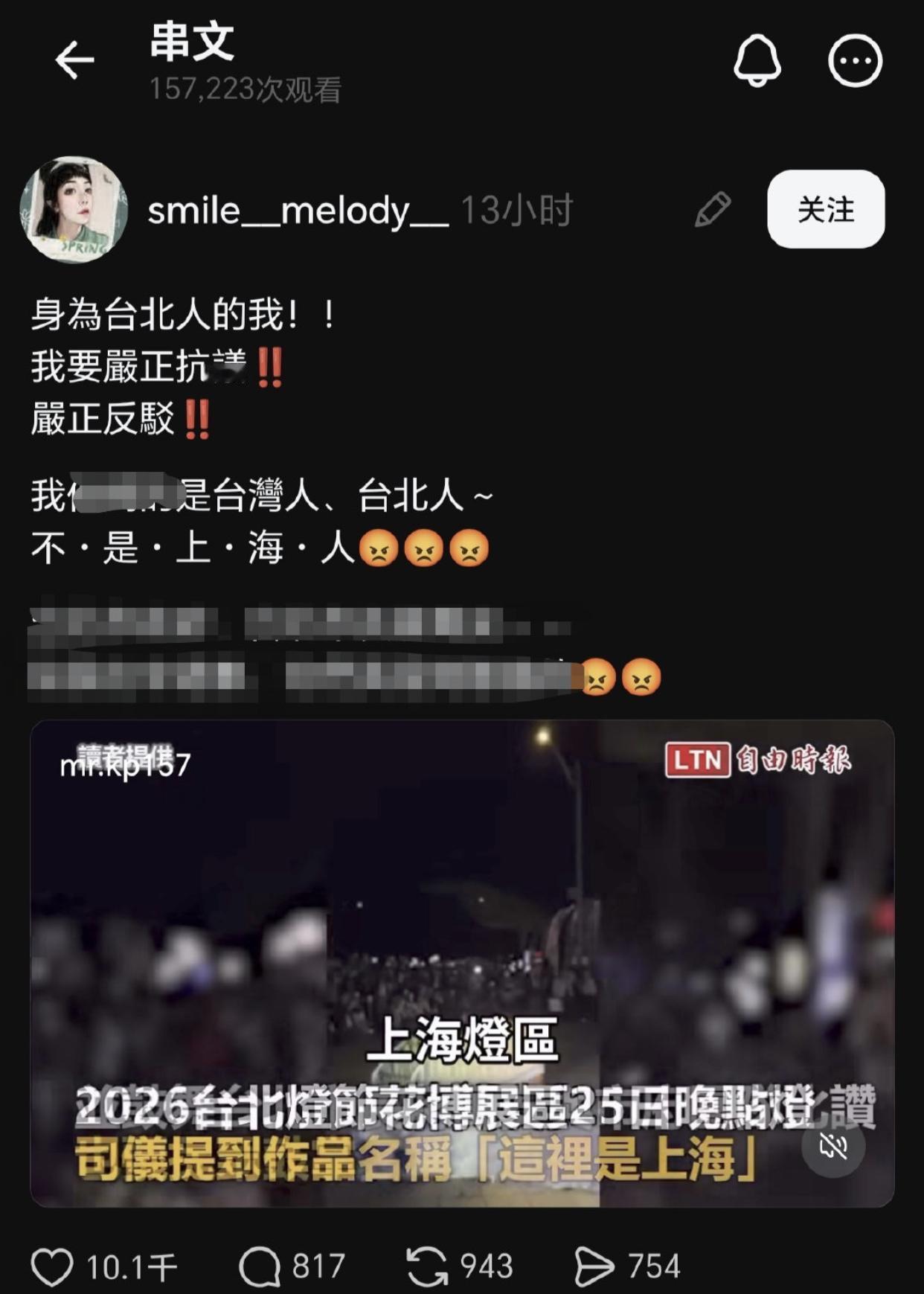 台媒:台湾台北举办灯展,在上海灯区里有个作品取名叫“这里是上海”,有大吃台湾豆腐之嫌,引发一些台湾人破防抗议,“这里是台湾台北,不是上海”。