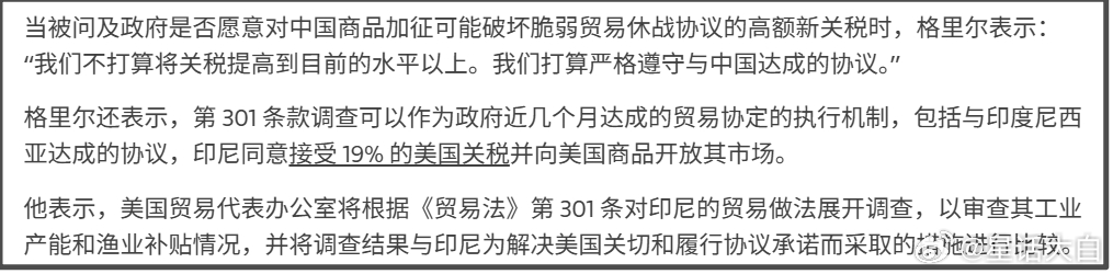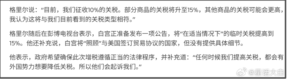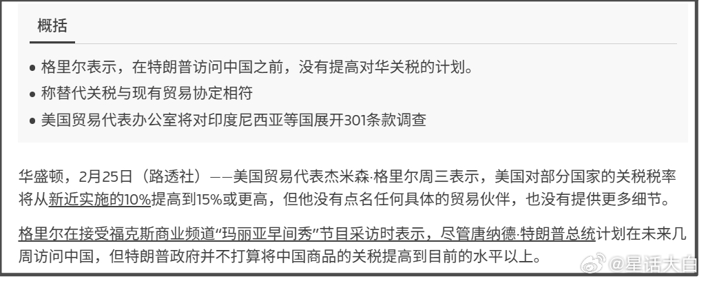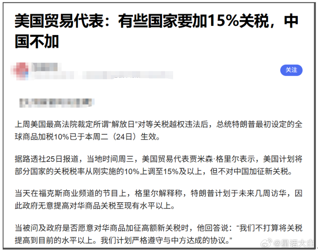 最近看到国内媒体的一篇报道,标题是《美国贸易代表:有些国家要加15%关税,中国不加》该报道称,据路透社25日报道,美国贸易代表贾米森·格里尔表示,美国计划将部分国家的关税税率从刚实施的10%上调至15%及以上,但不对中国加征新关税。我一开始看这个报道,就感觉不大对,因为特朗普应该不至于连15%关税也不对我们加,对我们保持10%关税,那就比欧日韩通过贸易协议谈出的15%关税还要低。不知道,还以为我们才是美国的盟友。所以,我就去查证了下。这个报道是引用路透社的报道,我就去查了路透社的报道原文。路透社报道原文,开头概括是说:“格里尔表示,在特朗普访问中国之前,没有提高对华关税的计划。”原文开头是说,格里尔表示,美国对部分国家的关税税率将从新近实施的10%提高到15%或更高,但他没有点名任何具体的贸易伙伴,也没有提供更多细节。第二段是说:“格里尔表示,尽管唐纳德·特朗普总统计划在未来几周访问中国,但特朗普政府并不打算将中国商品的关税提高到目前的水平以上。”这里需要注意,“美国对部分国家的关税税率提高到15%或更高”,跟“特朗普政府并不打算将中国商品的关税提高到目前的水平以上”,是分在两段话里,并不是在一句话。这两段话虽然被路透社整合在开头,但起码也不是像国内媒体这样直接整合在一句话里。事实上,格里尔这两段话中间是还有其他很多内容,并不是连续语境下说的。路透社报道正文里,格里尔说:“目前,我们征收10%的关税。部分商品的关税将升至15%,其他商品的关税可能会更高,我认为这将与我们目前看到的关税类型相符。”格里尔表示:“白宫正准备发布一项公告,将“在适当情况下”的临时关税提高到15%。他还补充说,白宫将“照顾”与美国签订贸易协议的国家,但没有提供具体细节。”在中间又扯了一段其他内容后,原报道才说:“当被问及政府是否愿意对中国商品加征可能破坏脆弱贸易休战协议的高额新关税时,格里尔表示:“我们不打算将关税提高到目前的水平以上。我们打算严格遵守与中国达成的协议。”所以,路透社报道原文,并没有把“美国计划将部分国家的关税税率从刚实施的10%上调至15%及以上”,与“不对中国加征新关税”,放到同一句话里,这是不连续的两段话,没有前后关联。但国内媒体整合成到一句话里,给人感觉是,美国只给其他国家加到15%关税,对我们仍然只加10%,但原文并没有这样肯定。#美国发动网攻侵占全球虚拟资产##美国贸易代表称对中国不加关税#