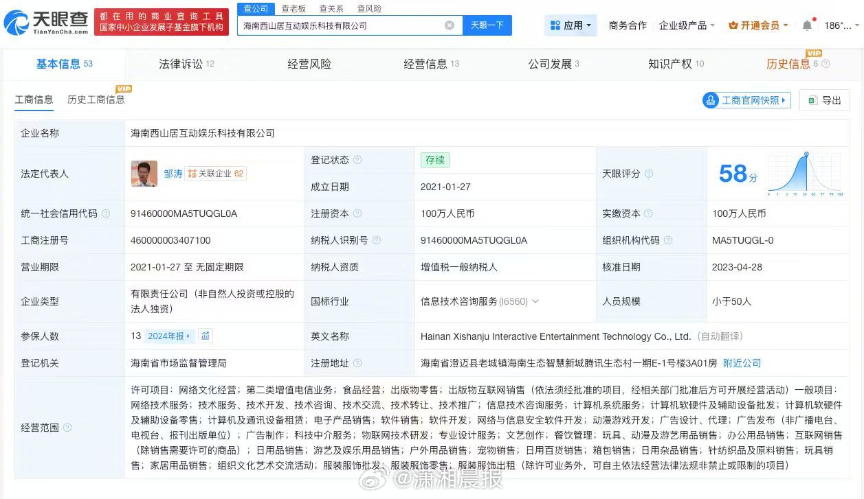 记者查询天眼查发现,海南西山居互动娱乐科技有限公司成立于2021年1月,法定代表人为邹涛,注册资本100万人民币,经营范围包括网络文化经营、第二类增值电信业务、食品经营、出版物零售、出版物互联网销售等,由珠海西山居世游科技有限公司全资持股。法律诉讼信息显示,该公司曾多次因网络服务合同纠纷等被起诉。