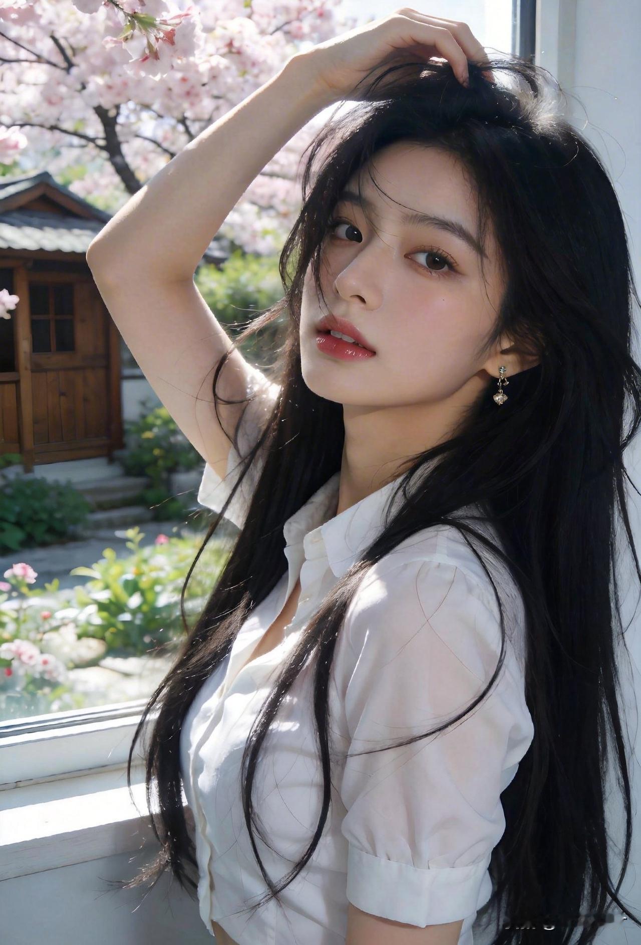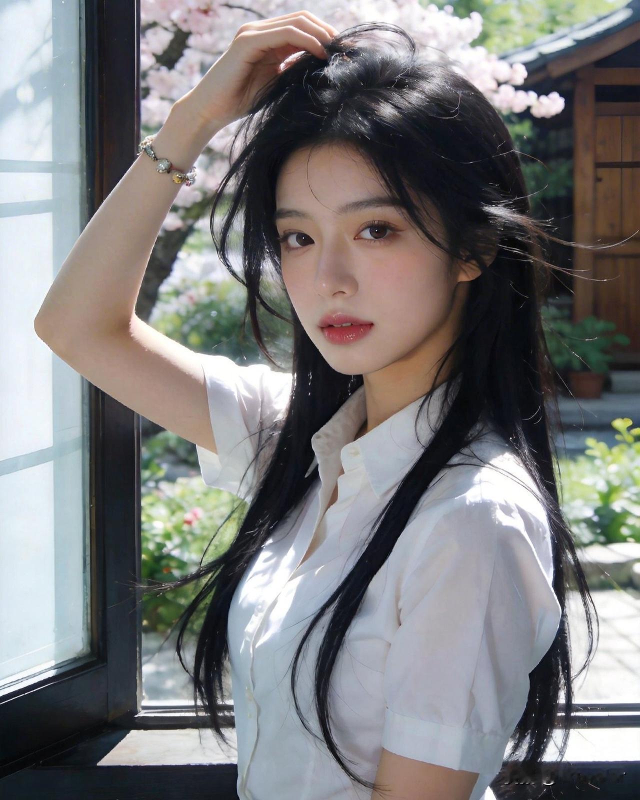 阳光洒进来的午后,黑发少女轻抚发丝,温柔动人。